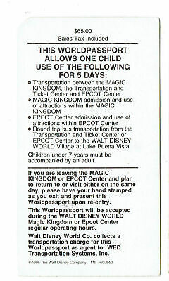 1987 Magic Kingdom Club Walt Disney World 5 day worldpassport Used Child Ticket