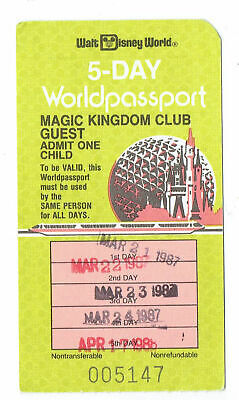 For Sale is a rare and hard to find vintage 1987 MKC Magic Kingdom Club Walt Disney World 5 day worldpassport Used Child Admission Ticket Stub. its In good USED Condition as pictured. no rips tears or writing in or on the guide just some minor handling wear. would make a wonderful addition to any Disneyana memorabilia collection. Please ask Any and All Questions prior to purchasing. Fast Same or Next day shipping with Free Delivery Confirmation within the U.S. Payment Due within 7 days of purchase (if you need more time please let us know In advance) we love to combine shipping is always a Yes and Most of the time Additional Items Ship for free.