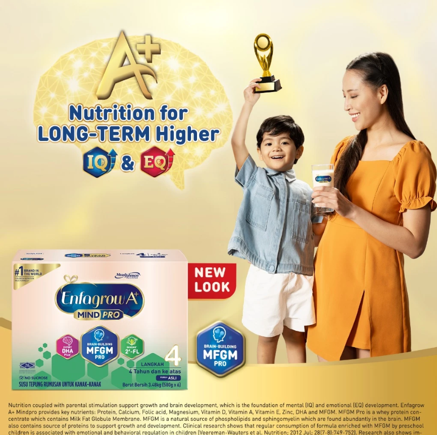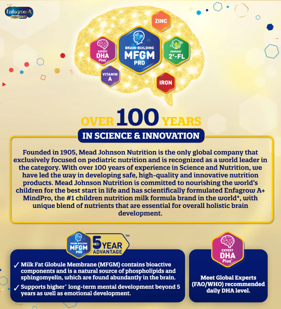 Enfagrow A+ MindPro Step 4 with MFGM Pro, DHA Pro and 2'-FL* Advance is a scientifically formulated milk powder for children aged 3- 6years old.