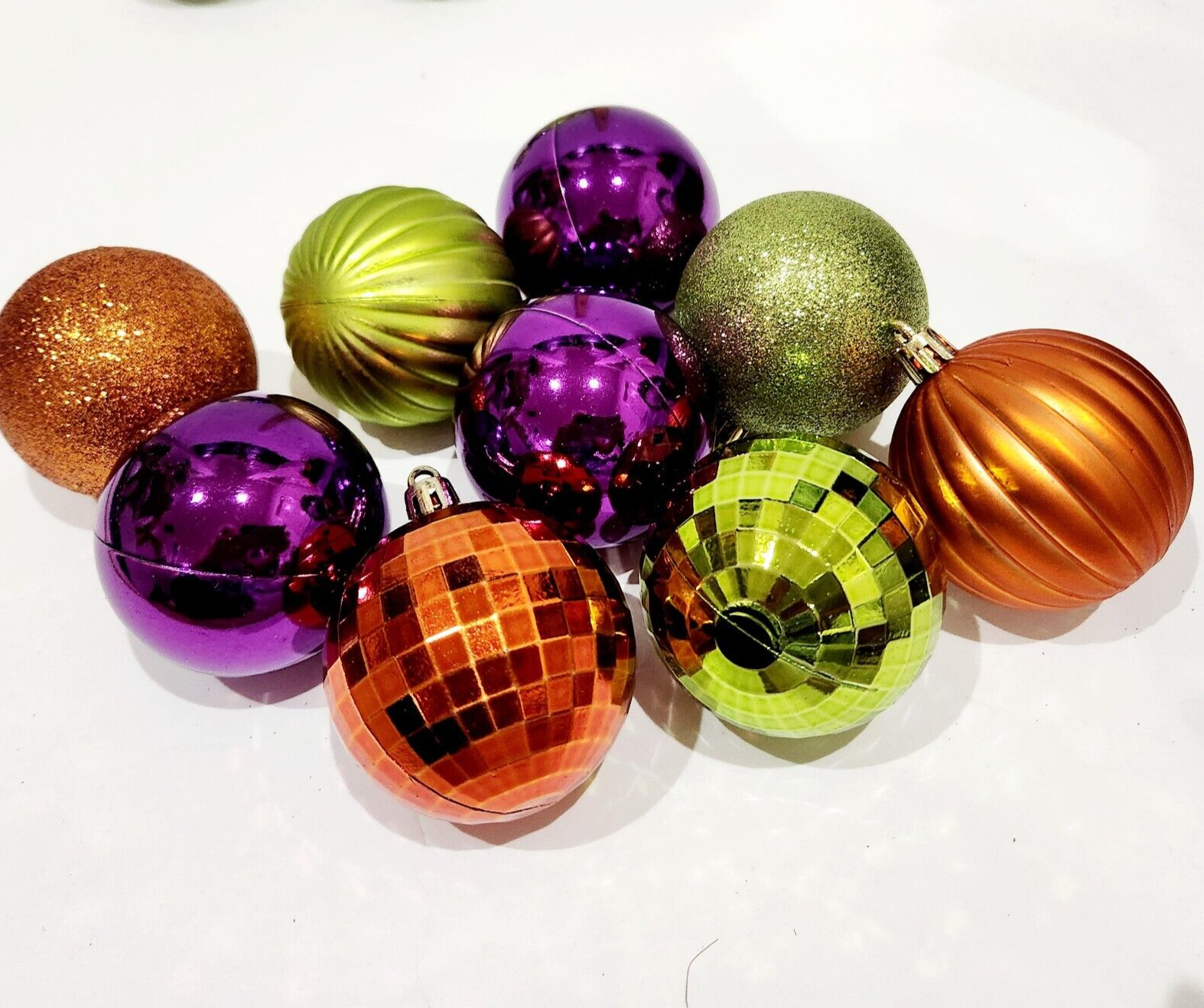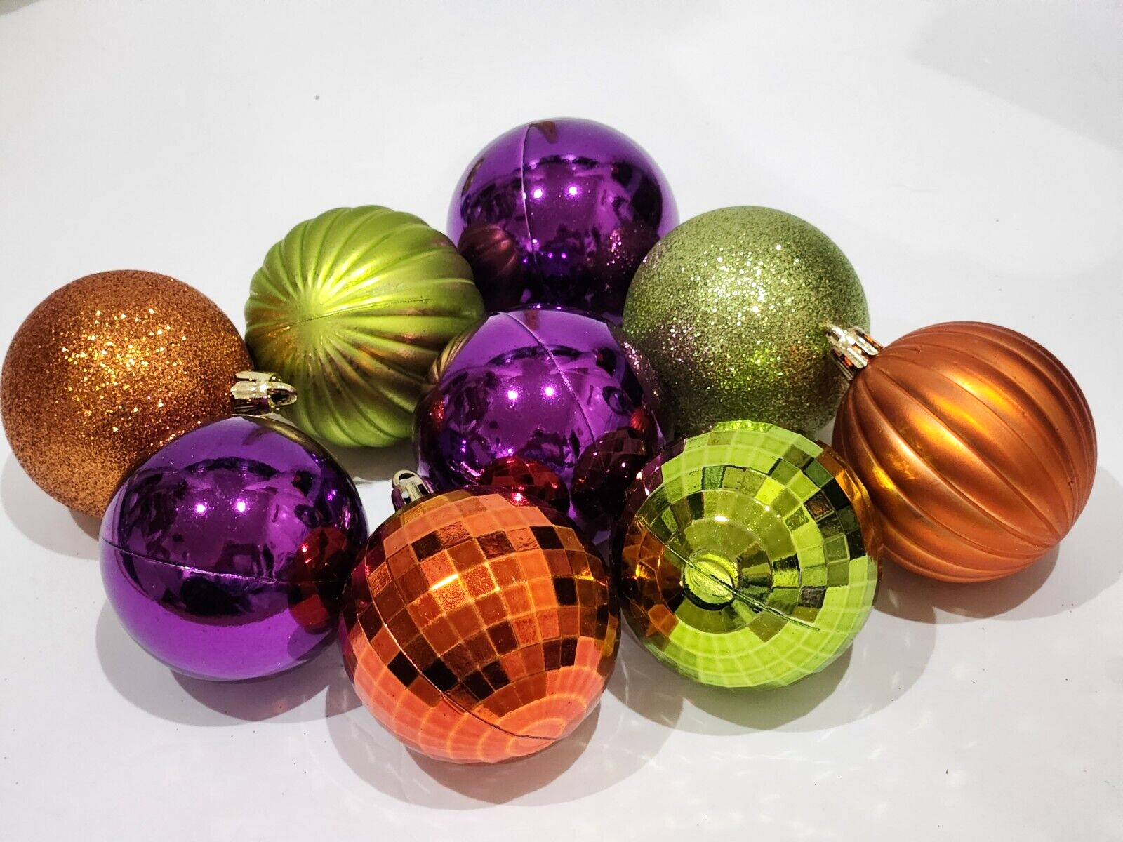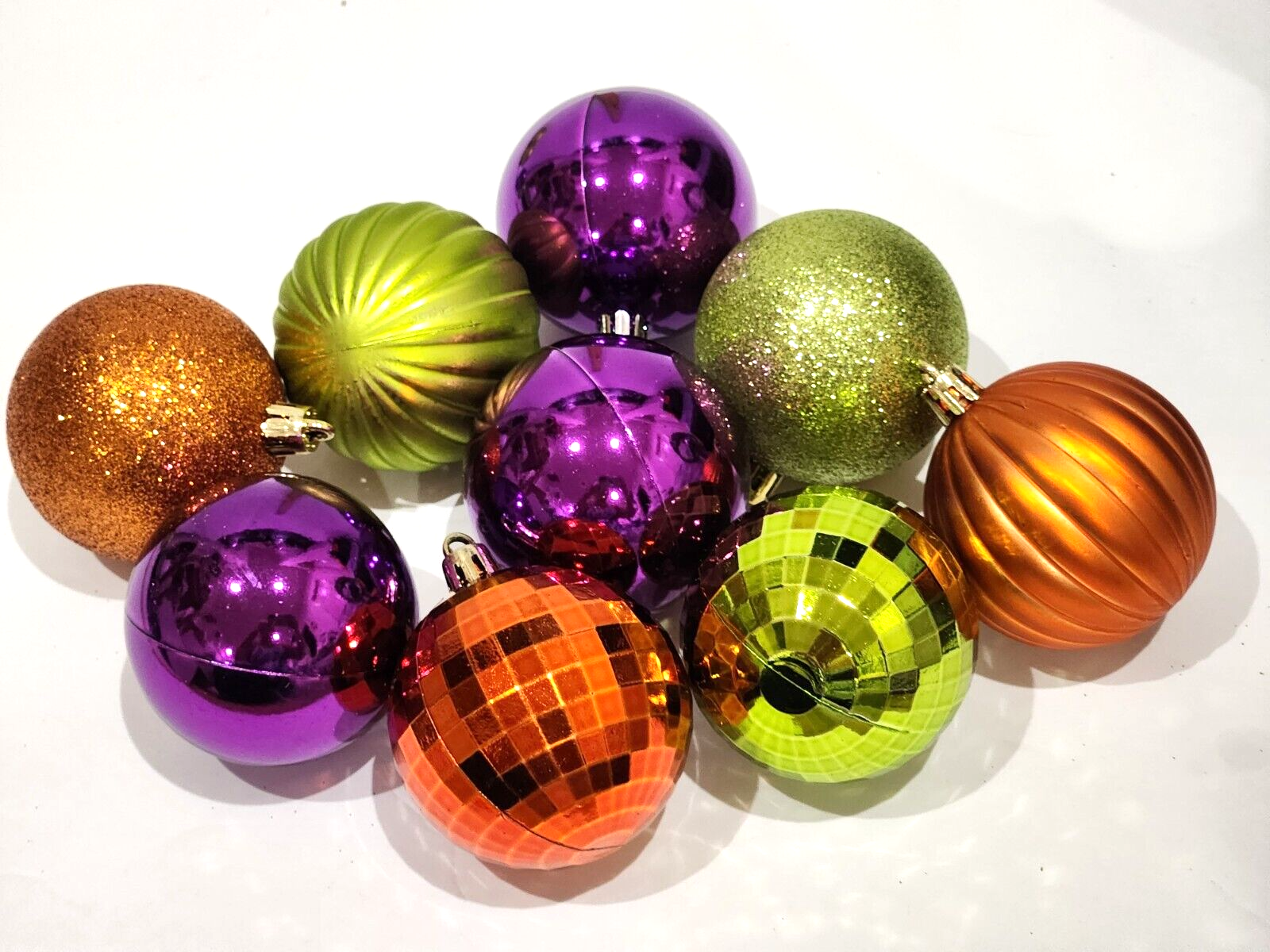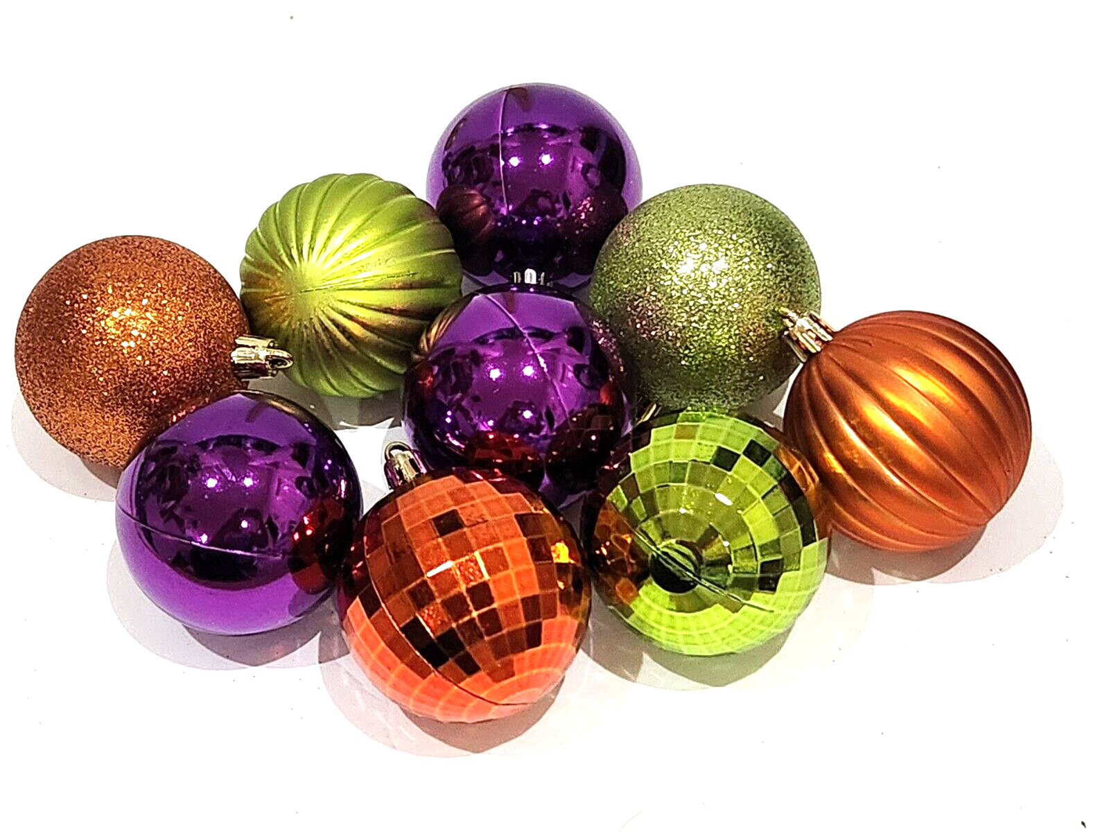 (9) Christmas Halloween Orange Purple Green Plastic Ornaments Tree Ddeco 2.75"