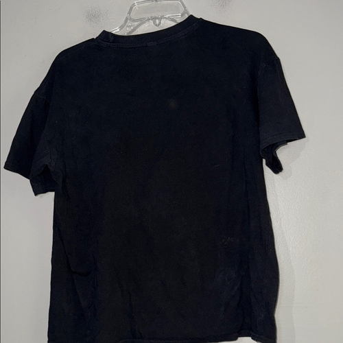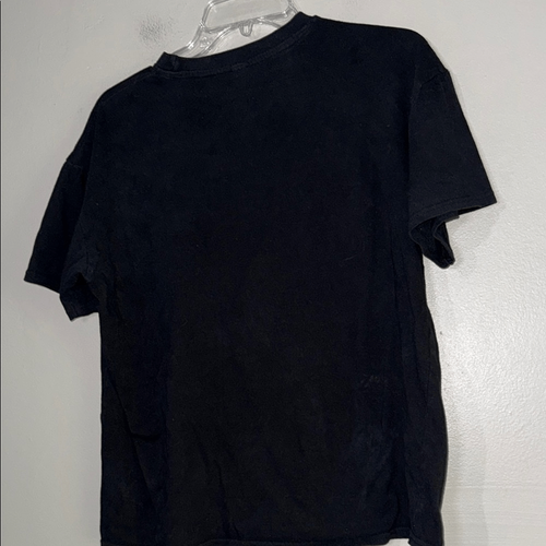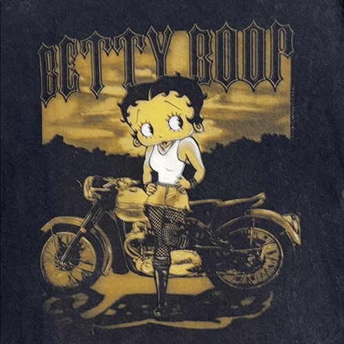 This black short sleeve tee features Betty Boop riding a motorcycle. The gold and brown tones of the design stand out against the black fabric, giving it a nostalgic and classic look. Perfect for adding a touch of retro flair to your casual wardrobe.