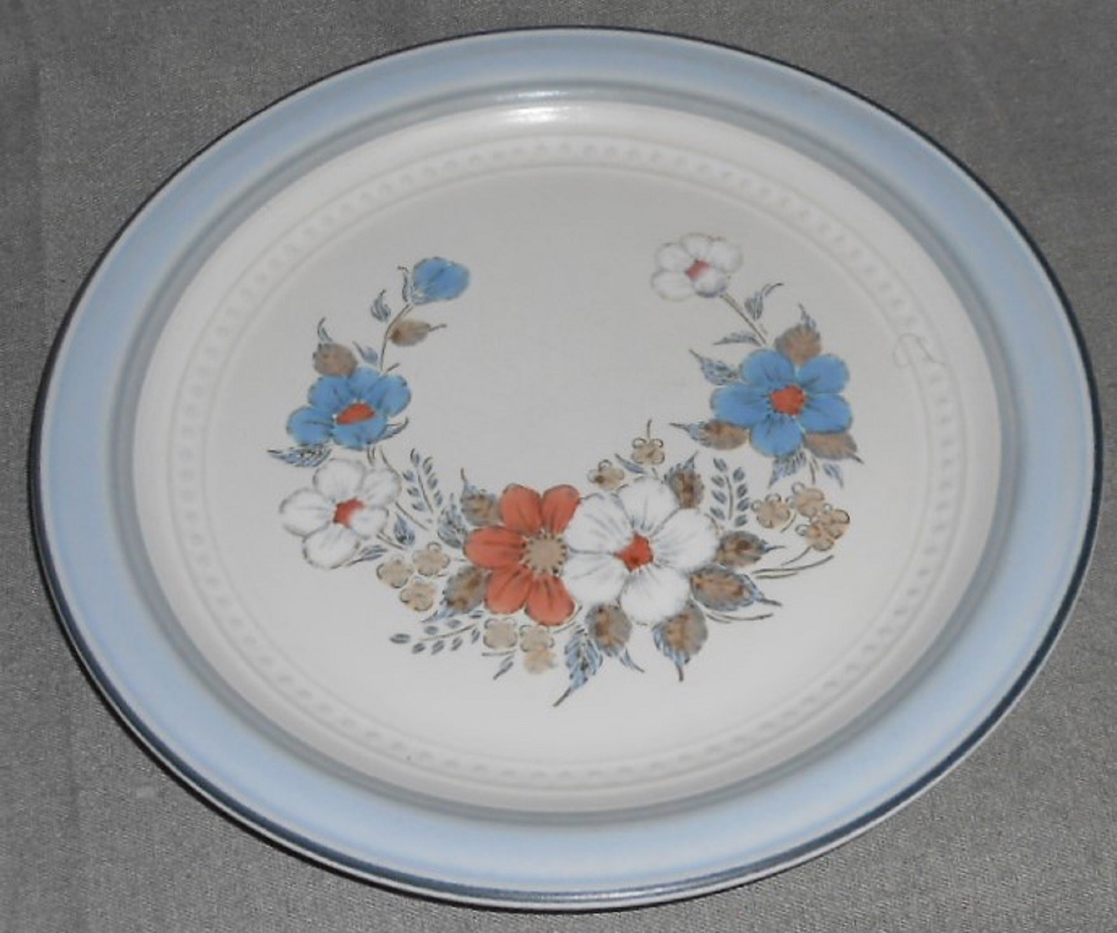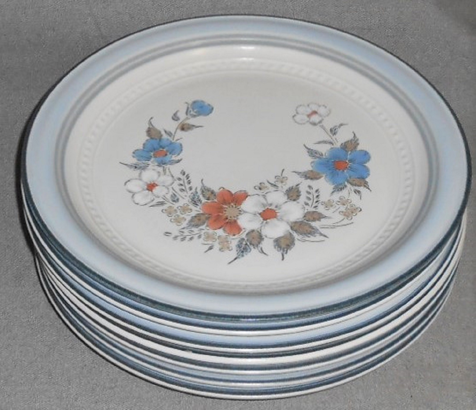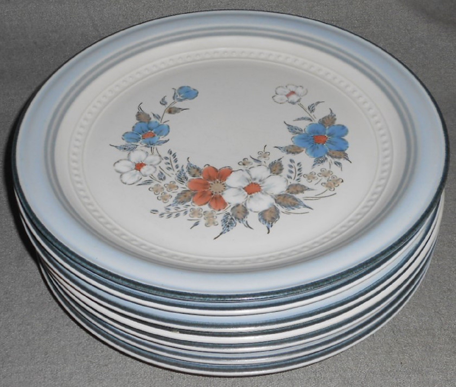 This is a very nice pattern that I originally thought was Denby as it goes well with a number of Denby Patterns but it is from Johann Haviland for Crowning Fashion Dinnerware in Japan and the Pattern is appropriately entitled Blue Bouquet. Great colors and design and all seven of the 10 3/4" Dinner Plates are in good pre-owned condition with no chips or cracks.
