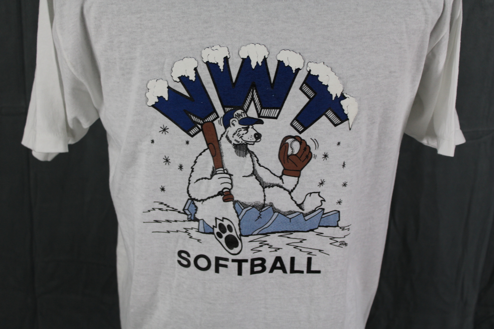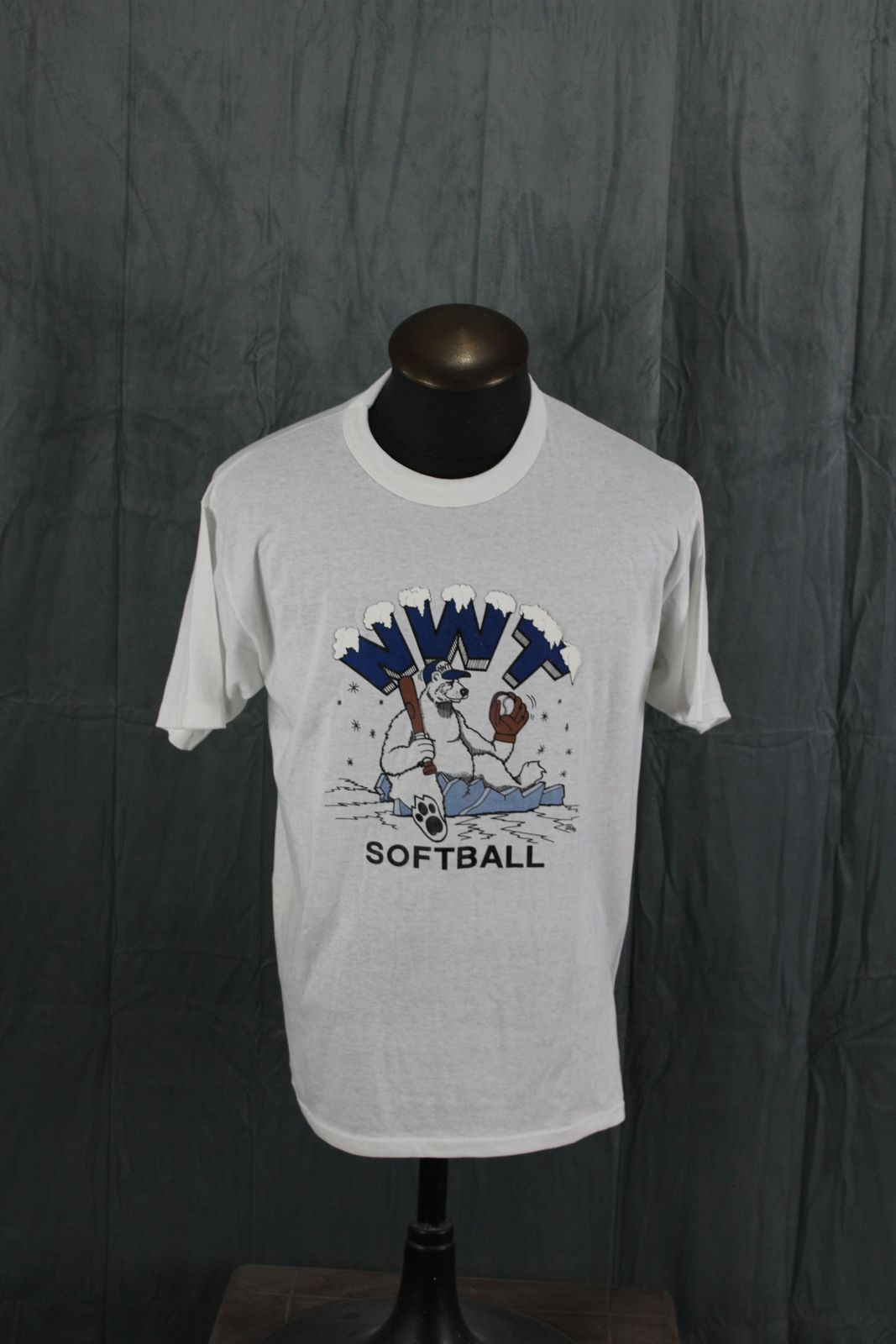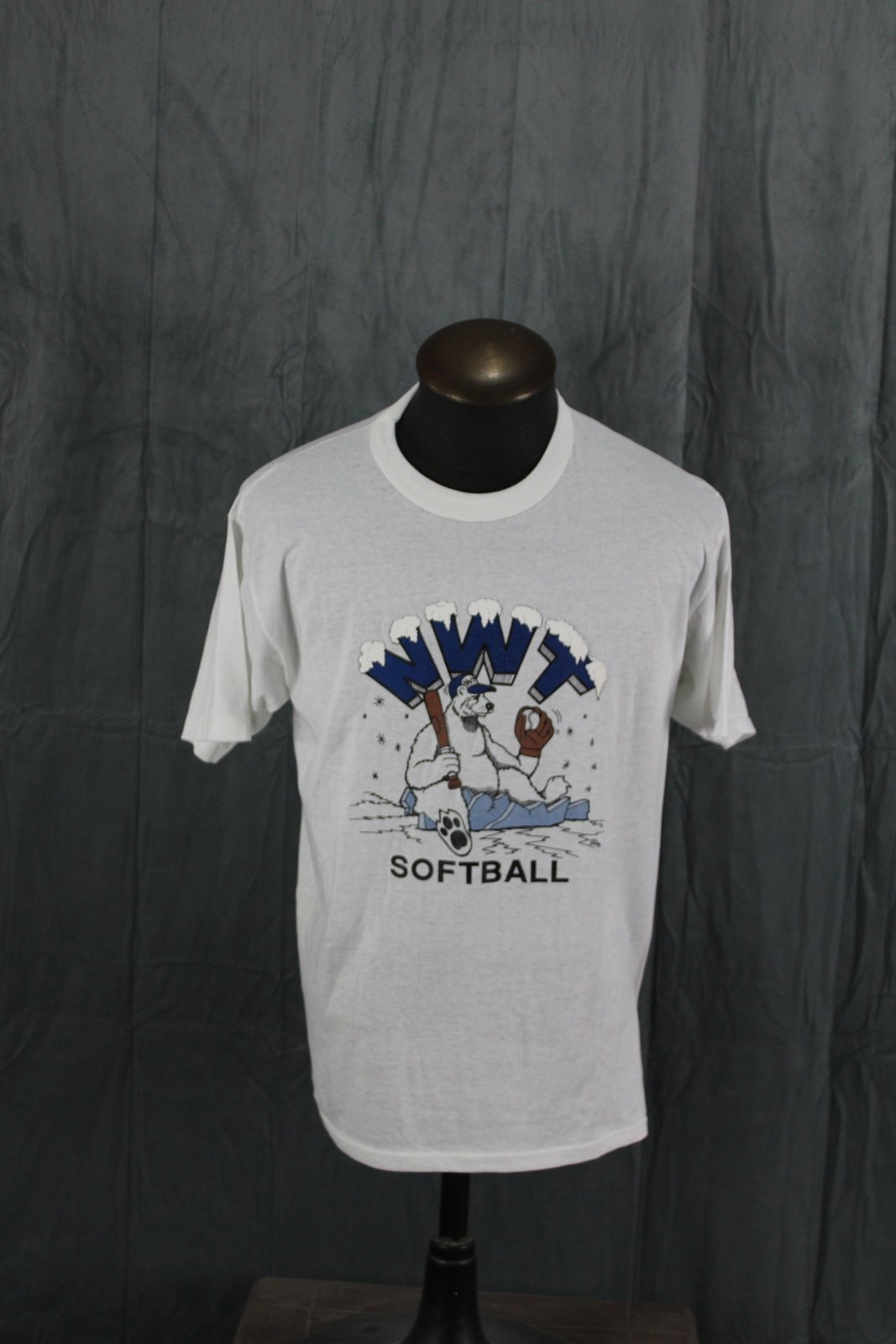 Up for sale is a vintage graphic t-shirt. It has a white base colour with a graphic of a polar bear in a baseball uniform with NWT Softball around it. What a great vintage shirt do not miss out on it.