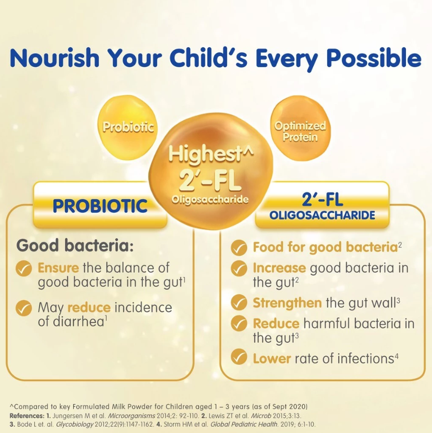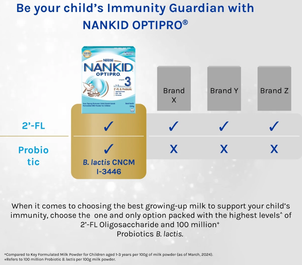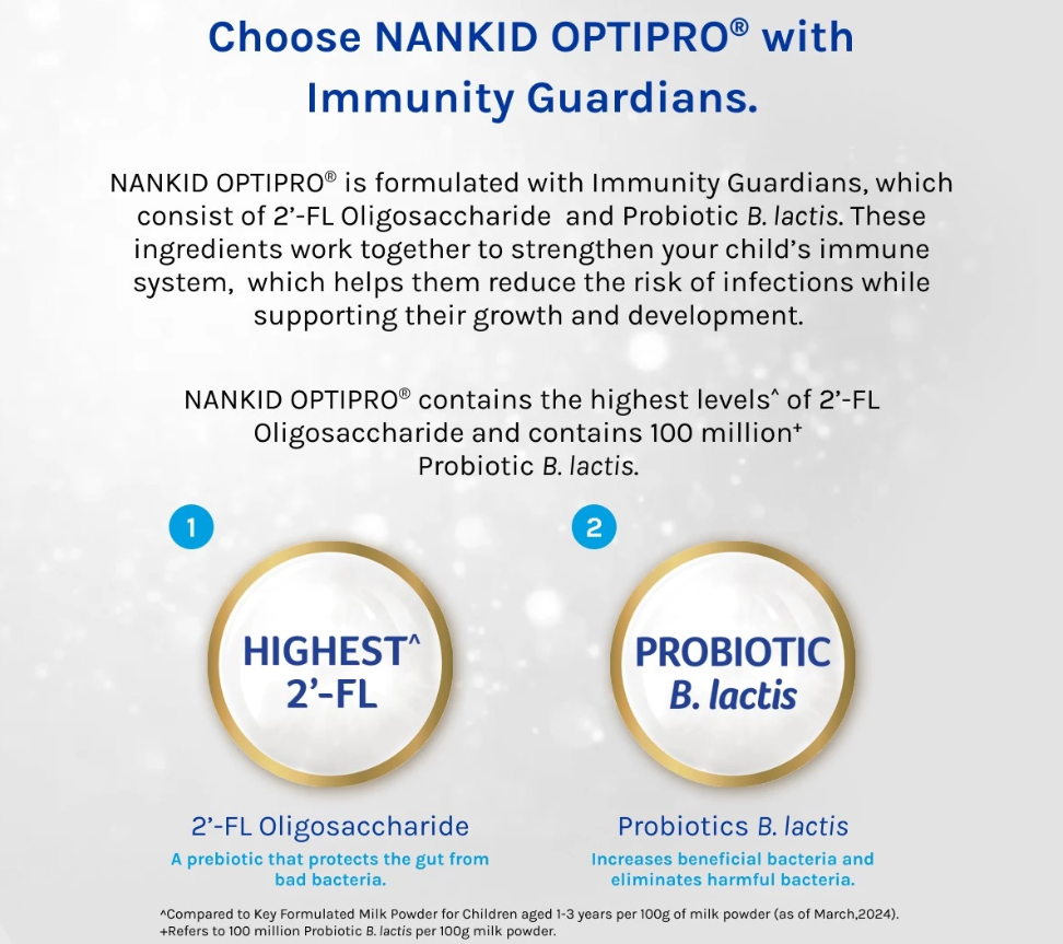 NEW NANKID OPTIPRO contains Hundred million units of Probiotics Cultures Bifidobacterium lactis CNCM I-3446 and 2'-FL Oligosaccharide. This is a new breakthrough innovation from Nestle NANKID and we are the only brand that introduce 2'-FL with probiotics in the GUM.This exclusive combination makes NANKID the one and unique OPTIPRO that help support a child's optimal growth and development.