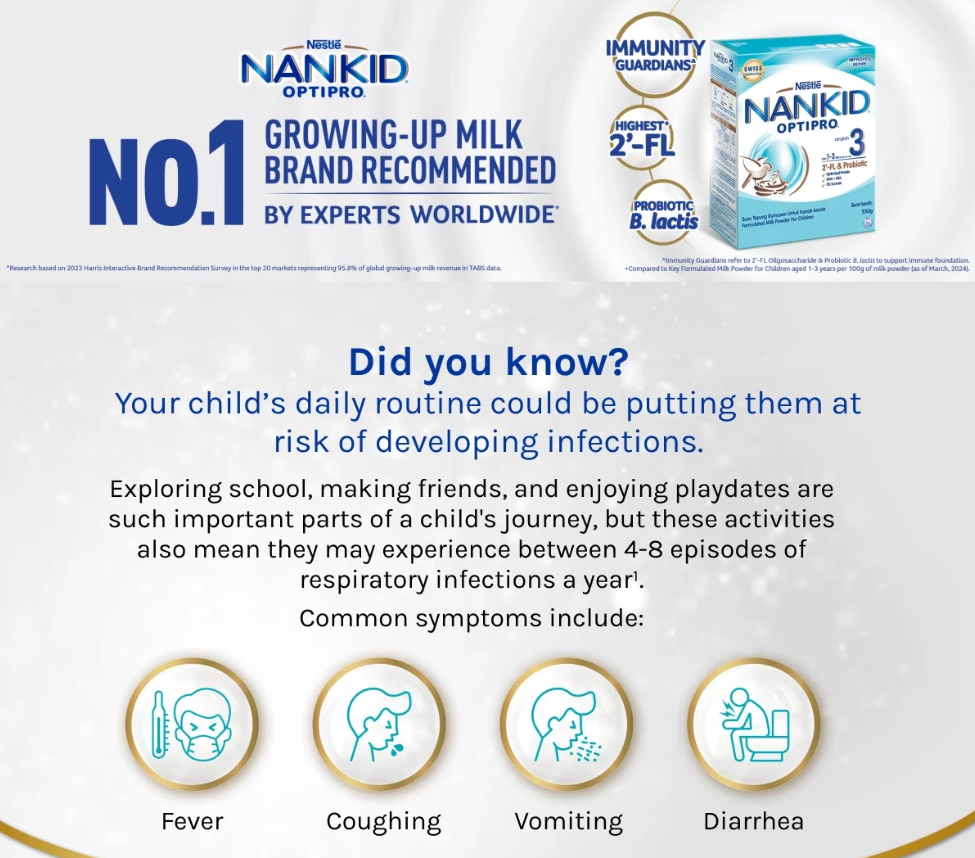 IMPORTANT NOTICE: We believe that breastfeeding is the best nutritional start for babies and we fully support World Health Organizations recommendation of exclusive breastfeeding for the first six months of life followed by the introduction of adequate nutritious complementary foods, along with continued breastfeeding up to two years of age. NANKID HA 3, NANKID OPTIPRO 3 NANKID OPTIPRO 4 Formulated Milk Powder are not a breast milk substitute. We recommend that you speak to your healthcare professional about how to feed your child and seek advice on when to introduce this product. ?