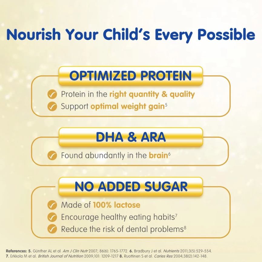 · Reduce diarrhea incidence Optimized Protein is protein in the right quantity and quality needed for a child?s optimal growth and development DHA and ARA: These are found abundantly in the brain, and support overall development in children