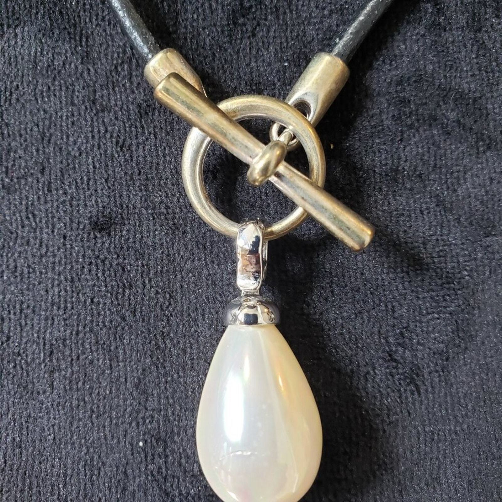 Womens Baroque Drop Pearl Shell Leather Cord Necklace with Round Toggle Clasps.