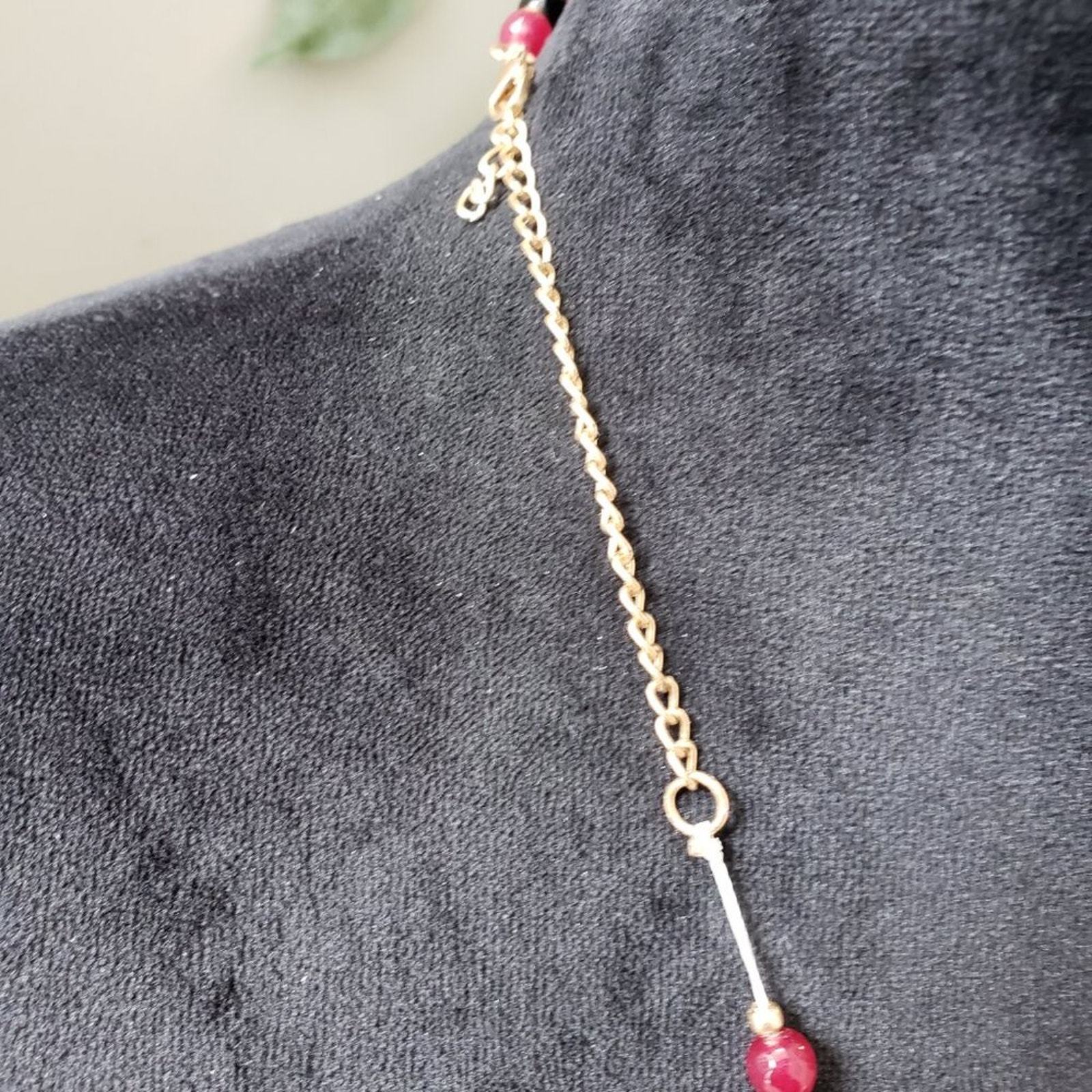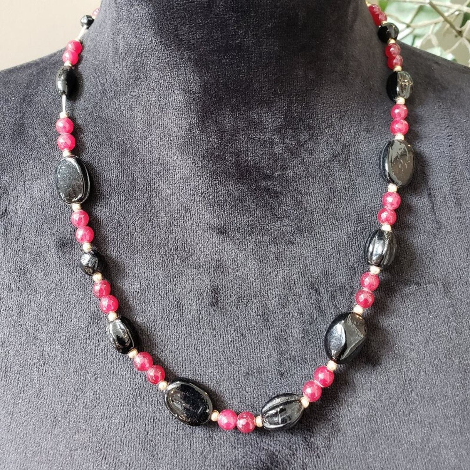 Womens Fashion Art Deco Red Cherry Quartz Black Onyx Necklace with Lobster Clasp.