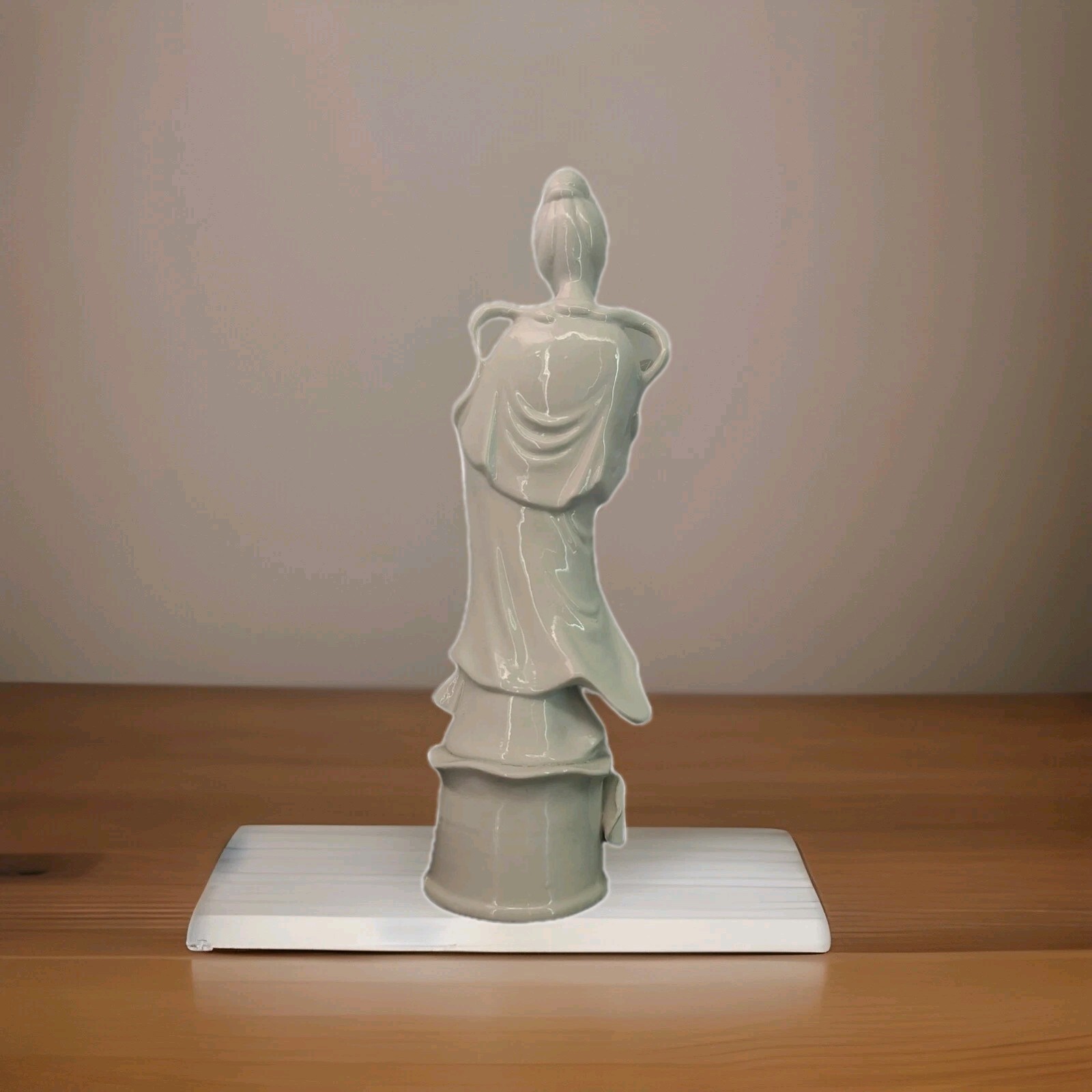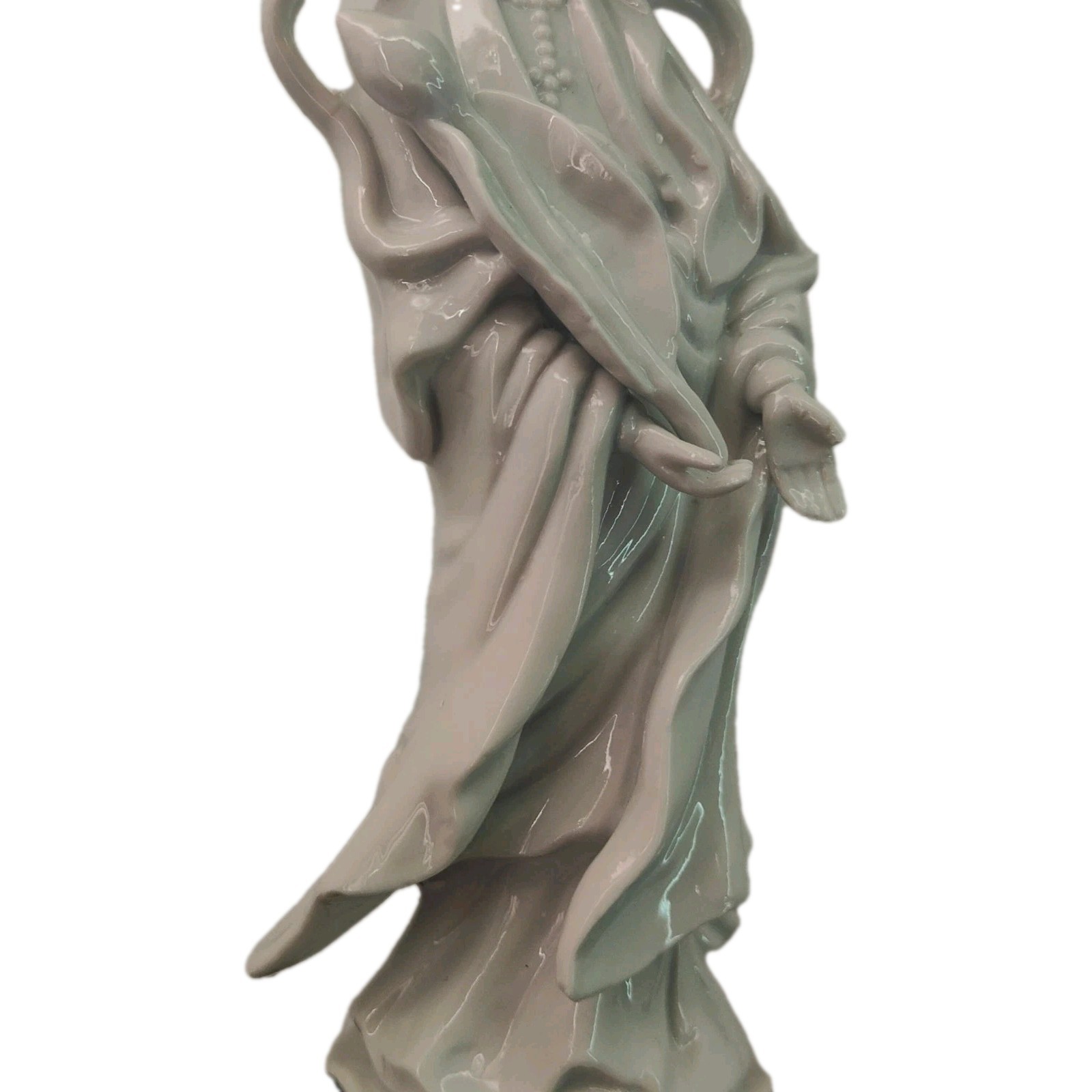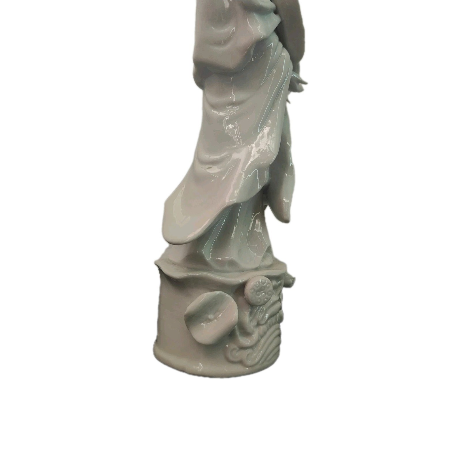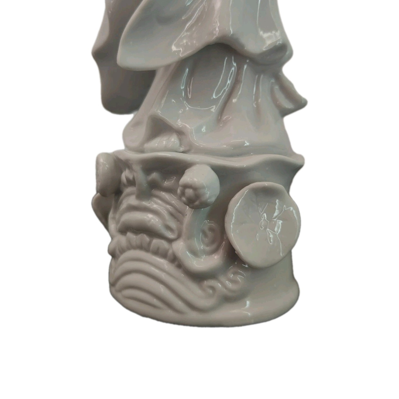 This vintage Homco Quan Yin figurine embodies the essence of compassion and mercy in Buddhism, making it a spiritual and collectible piece for any room. Crafted in white porcelain with a glazed finish, this 12-inch figurine exudes a sense of serenity and tranquility, perfect for meditation or prayer. Made in Taiwan during the mid 20th century, this figurine is a timeless and elegant addition to any decor collection.