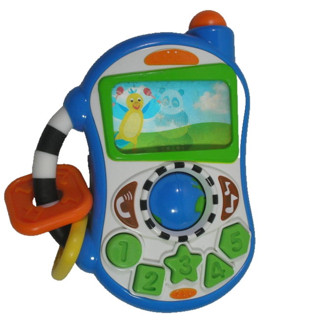 "The Baby Einstein Lights and Melodies Discovery Phone is a multi-sensory toy that engages babies with lights, music, and phone sounds. It features a peek-a-boo mirror for self-discovery and two 'buttons' that light-up. Features five numbered keys, a rollerball in the middle, and two teething toys (top left). Hard to find item!"