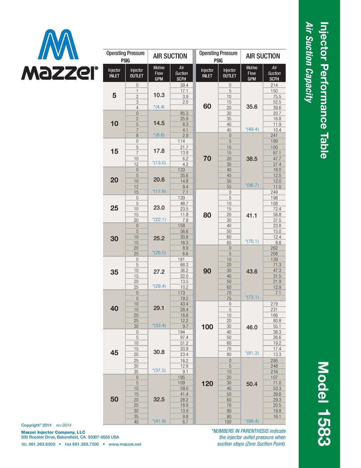 Mazzei venturi injectors operate over a wide range of pressures and require only a minimal pressure differential between the inlet and outlet sides to initiate a vacuum at the suction port. The injectors?? internal mixing vanes create thousands of microbubbles, which greatly increases the surface area of gas (air, oxygen, ozone, etc.) in contact with the liquid. Several microbubbles have a greater surface area than one large bubble of the same volume. Higher surface area facilitates greater solubility.