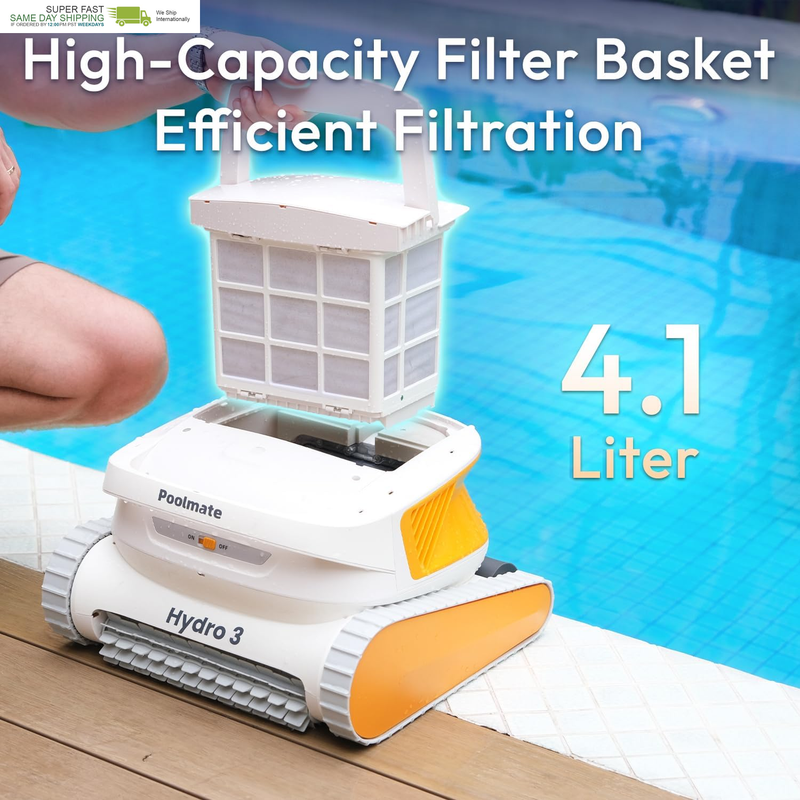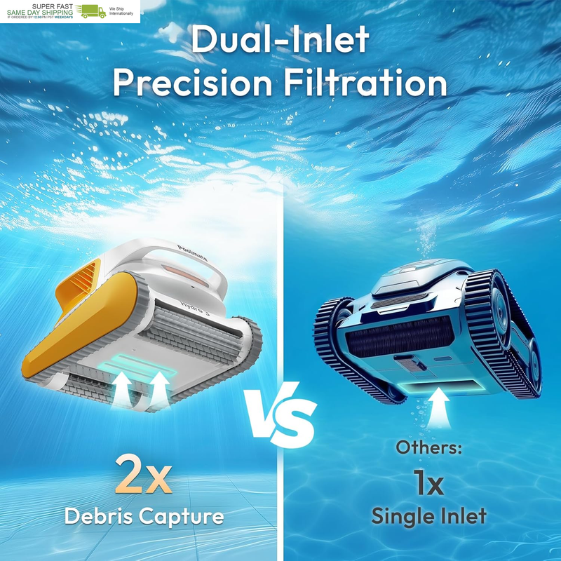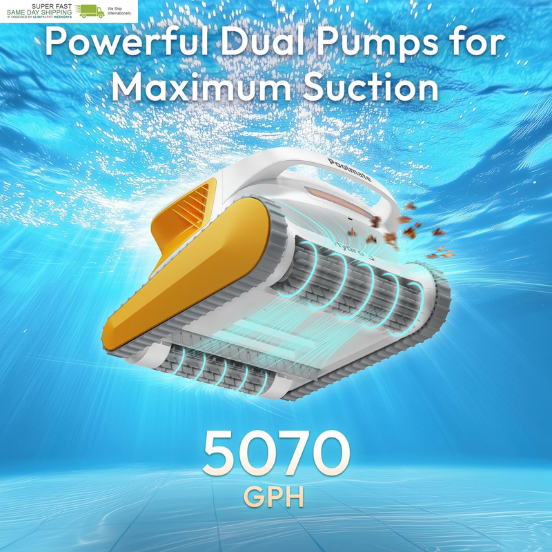 Powerful 5,070 Gallons Per Hour Filtration System: Featuring twin turbo centrifugal brushless motors, this pool vacuum generates exceptional suction power that effectively captures and removes fallen leaves, fine sediment, fibers, hair, and stubborn debris from both pool floors and walls, resulting in visibly cleaner water and reduced chemical requirements