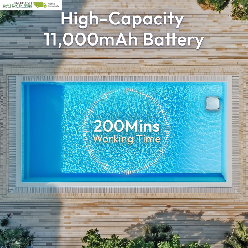 Unrivaled 200-Minute Operating Capacity: Equipped with a premium 11000mAh battery, our pool robot delivers unmatched 3+ hour continuous cleaning performance. This extended runtime exceeds industry standards and ensures complete coverage of even large pools in a single cleaning cycle, eliminating the frustration of mid-cleaning recharges