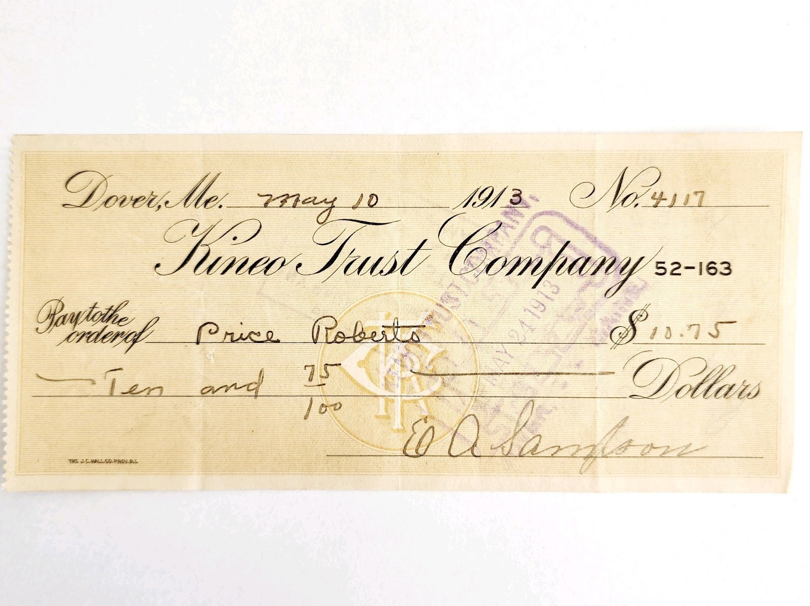 1913 Kineo Trust Company Bank Check E.A. Sampson Dover Maine Signed 4117 CHX5