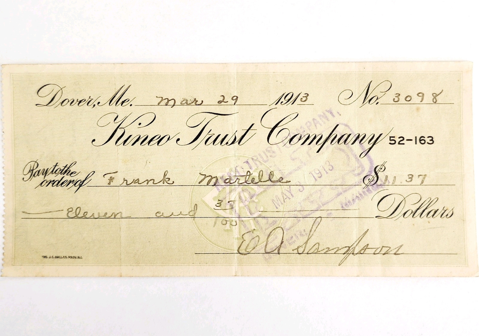 1913 Kineo Trust Company Bank Check E.A. Sampson Dover Maine Signed 3098 CHX5