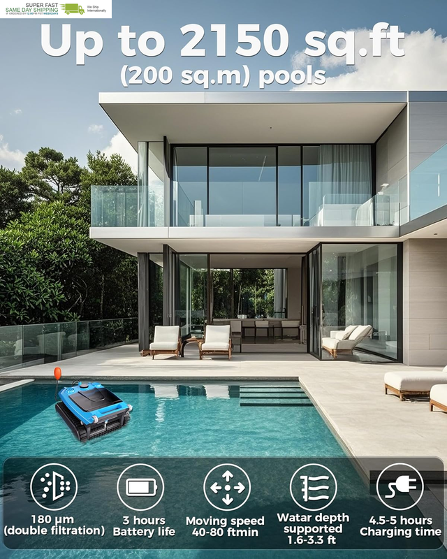 ?180-Minute Long Battery Life?Powered by a 10,000mAh built-in battery, the cleaner runs continuously for 3 hours after a 5-hour charge?enough to thoroughly clean a 200 sqm pool 1?2 times. Spend less time on pool upkeep and more time enjoying it!