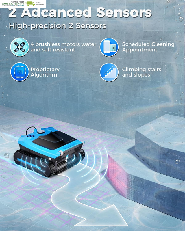 ?Dual Ultrasonic Sensors?Equipped with dual ultrasonic sensors, the robot navigates confidently even in turbid water, detecting obstacles, adjusting direction to avoid collisions, and optimizing cleaning routes for full pool coverage.