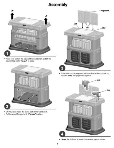 Grow with me Workshop offers parents a smaller size for toddlers and more realistic roleplay for preschoolers, in a workshop that grows with their child. In the toddler mode the workshop is sized appropriately in height for easy access for fun activity play. For the older child, the height easily transforms to a preschool workshop, revealing 2 additional tool storage areas. The workshop features a drill press with realistic sounds and motions and a real working vise.