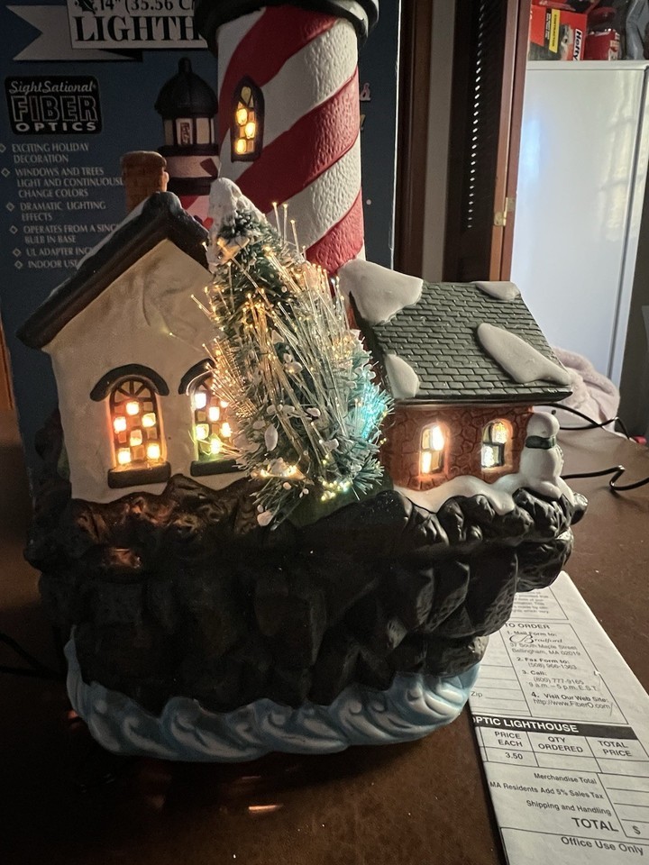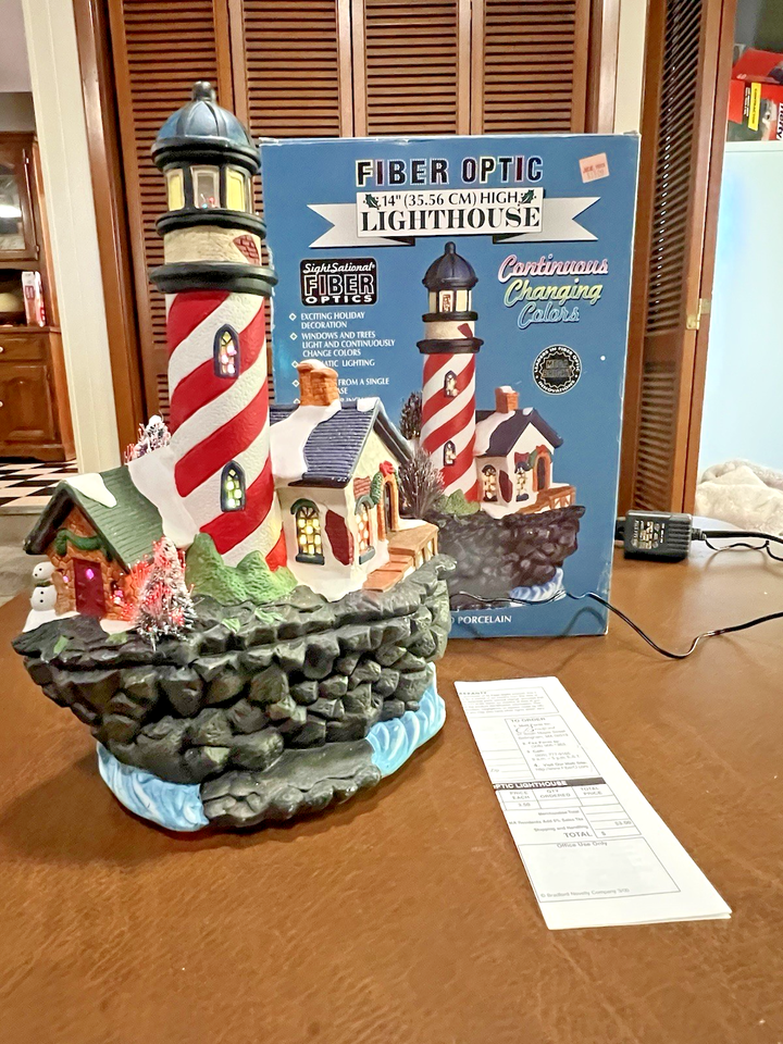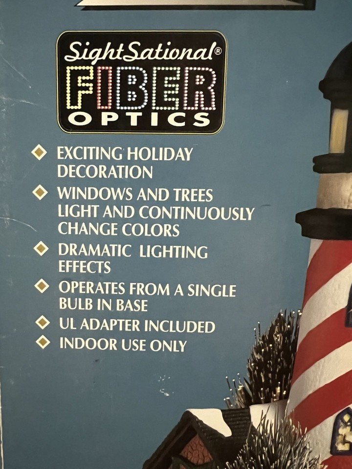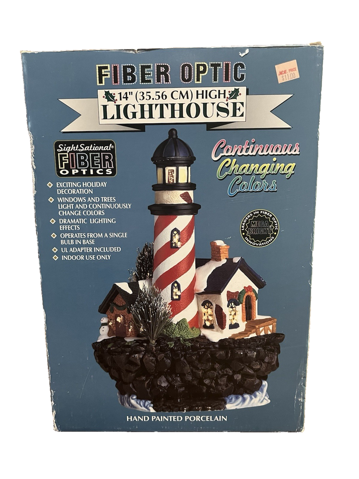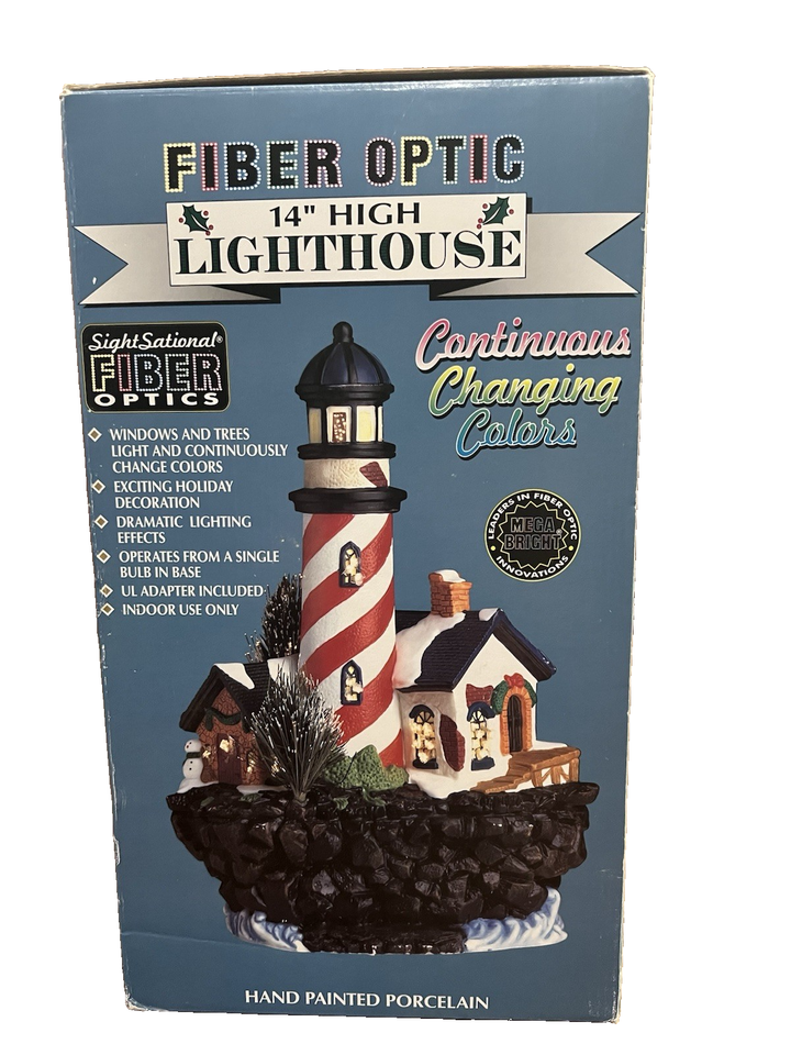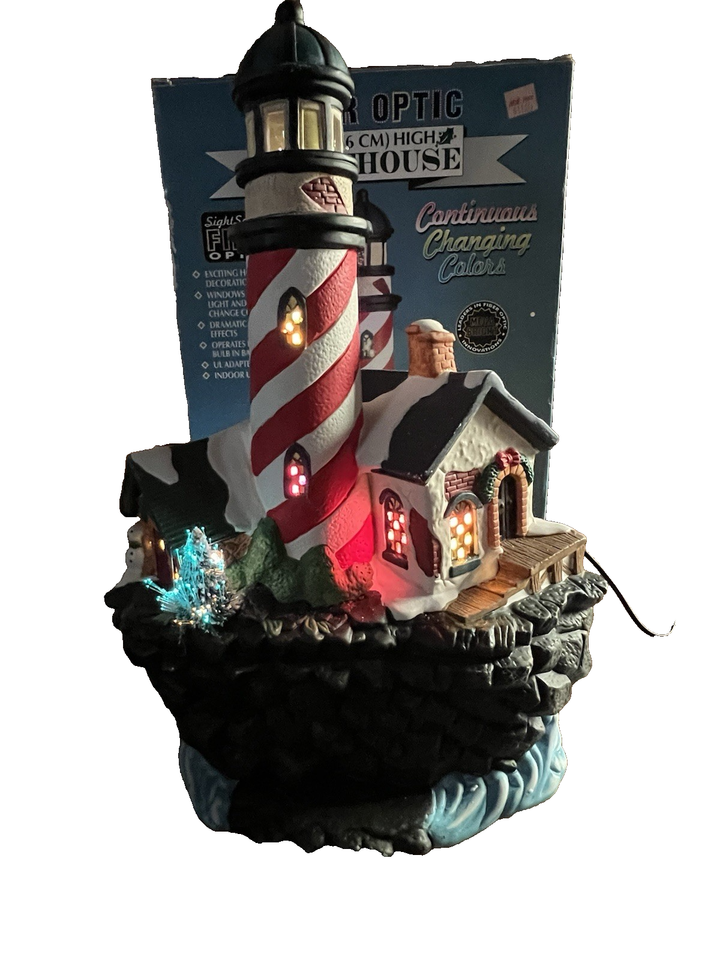 Crafted in 2007, this piece features a detailed lighthouse subject that glows with a delightful multicolor fiber optic effect, sure to brighten any room. It comes boxed, making it an easy addition to your collection or a thoughtful gift for a loved one. Celebrate the holidays with a touch of coastal elegance. looks beautiful works nicely box may have some wear