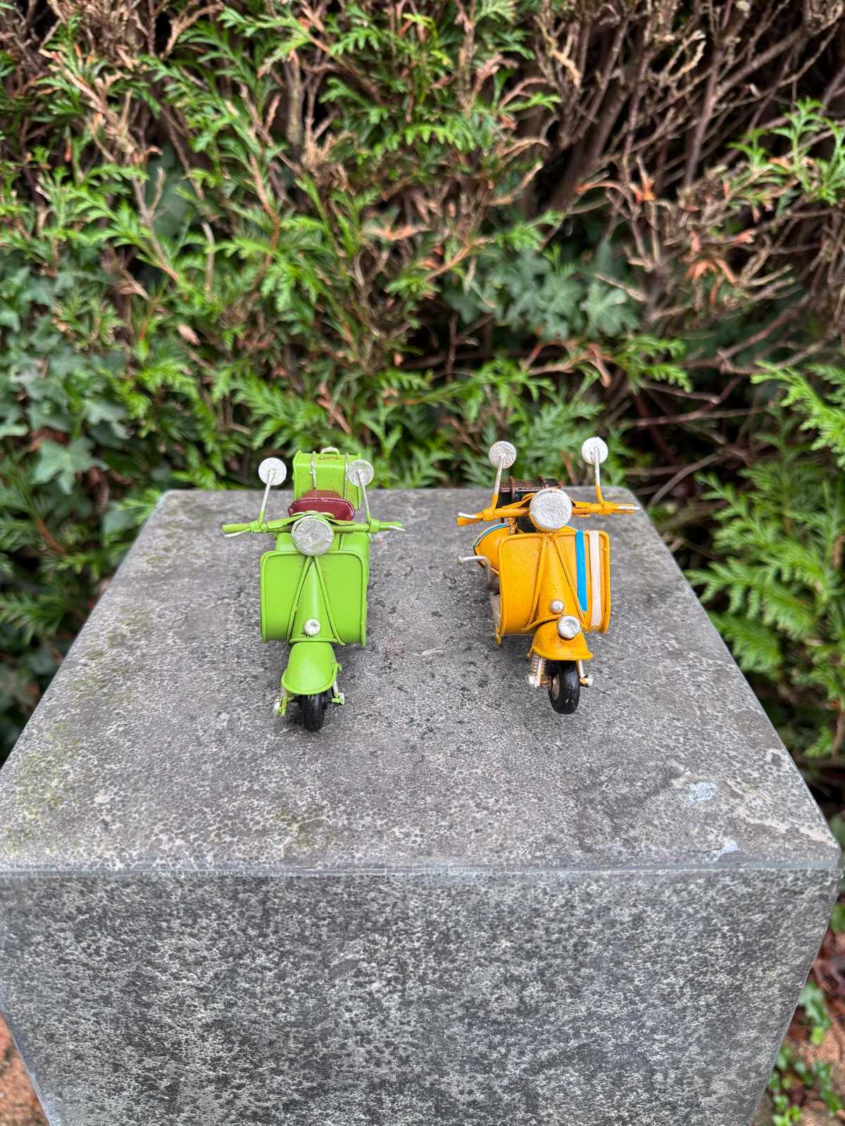 Set of two colorful iron scooter miniatures with travel details. A fun and nostalgic decor accent for desks, shelves, or retro displays.