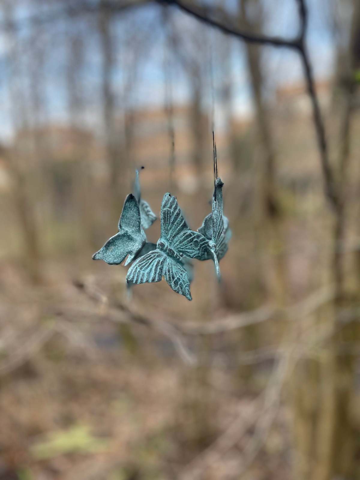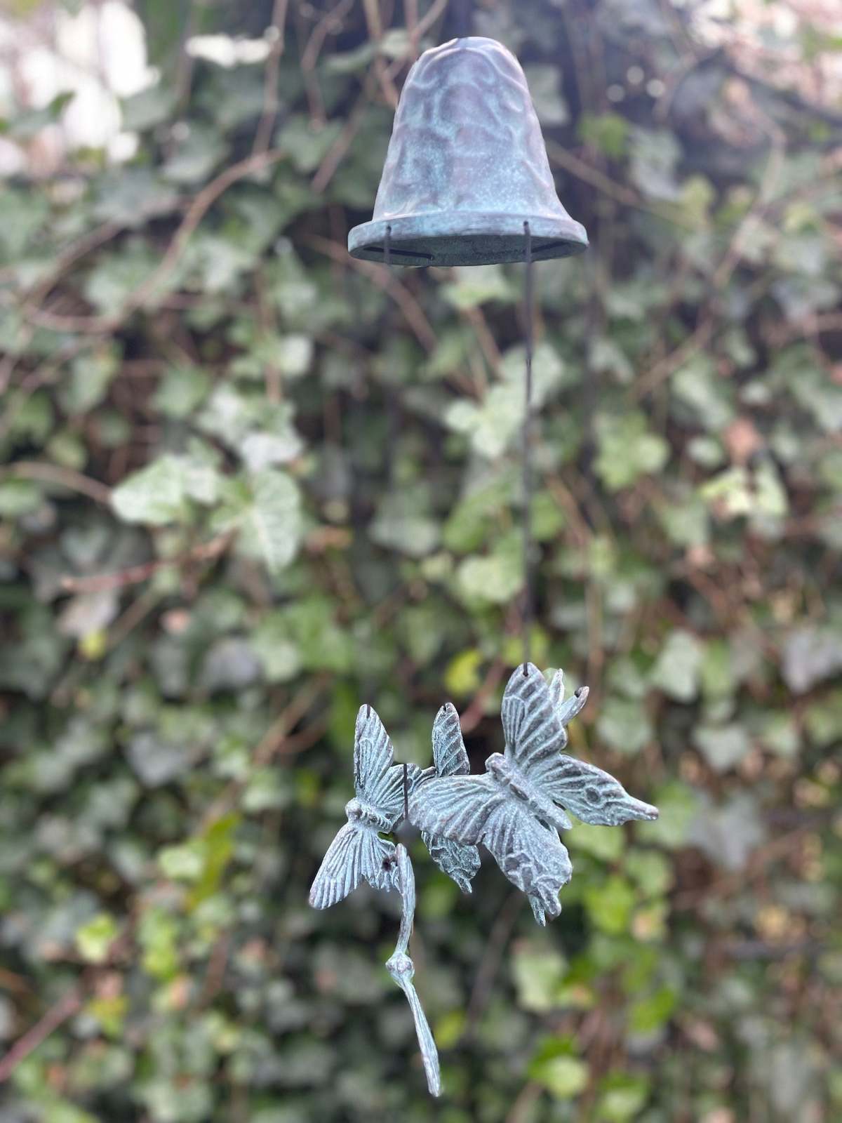 Bronze butterfly wind chime sculpture with soft patina. A soothing and decorative piece, perfect for your home and for gifting with natural elegance.