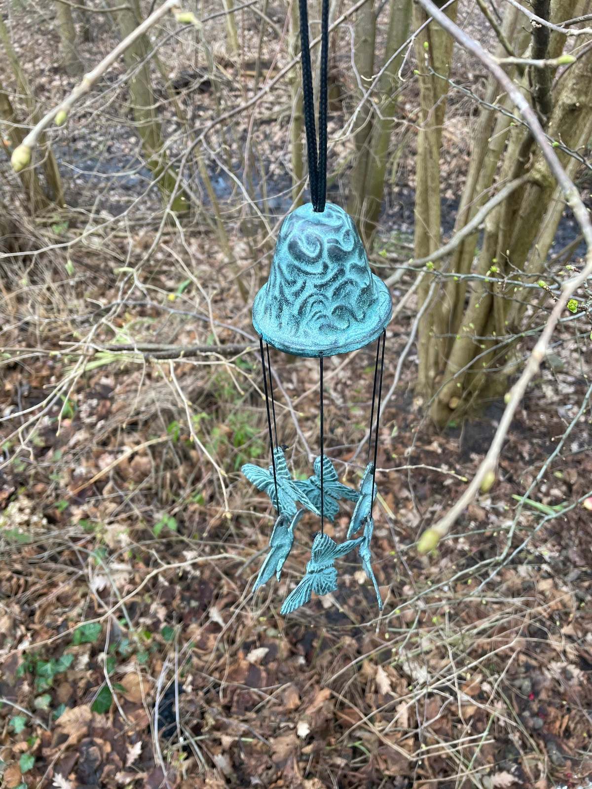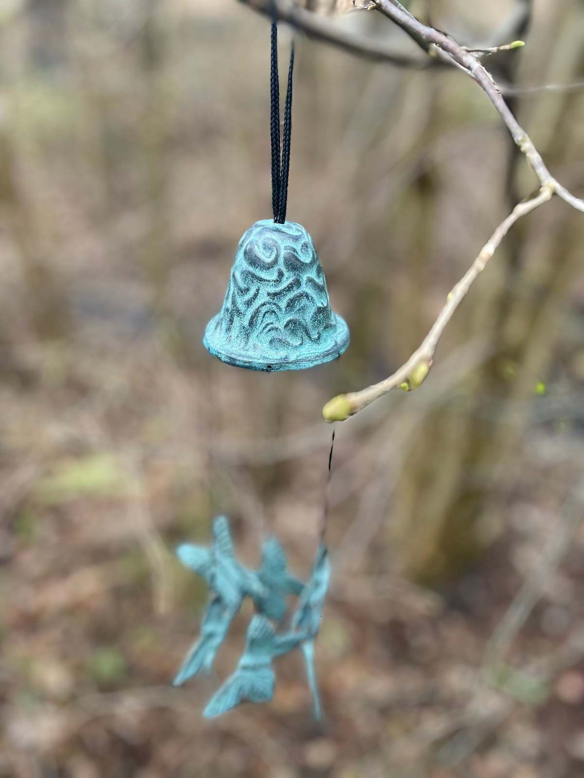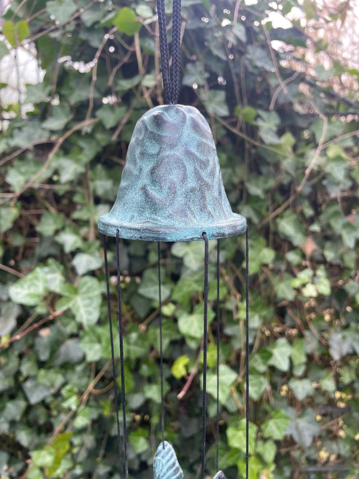 Delicate and enchanting, this bronze wind chime features a graceful bell from which several butterflies gently hang, swaying with the breeze. The detailed wings and soft patina give the piece an ethereal presence, while the subtle sound adds a calming atmosphere to gardens, balconies, or quiet indoor corners. It is both a sculpture and a sound piece, celebrating the beauty of transformation and harmony in nature.