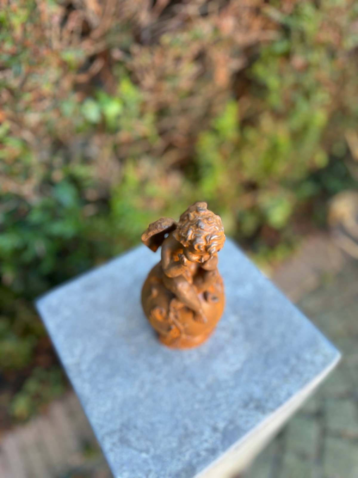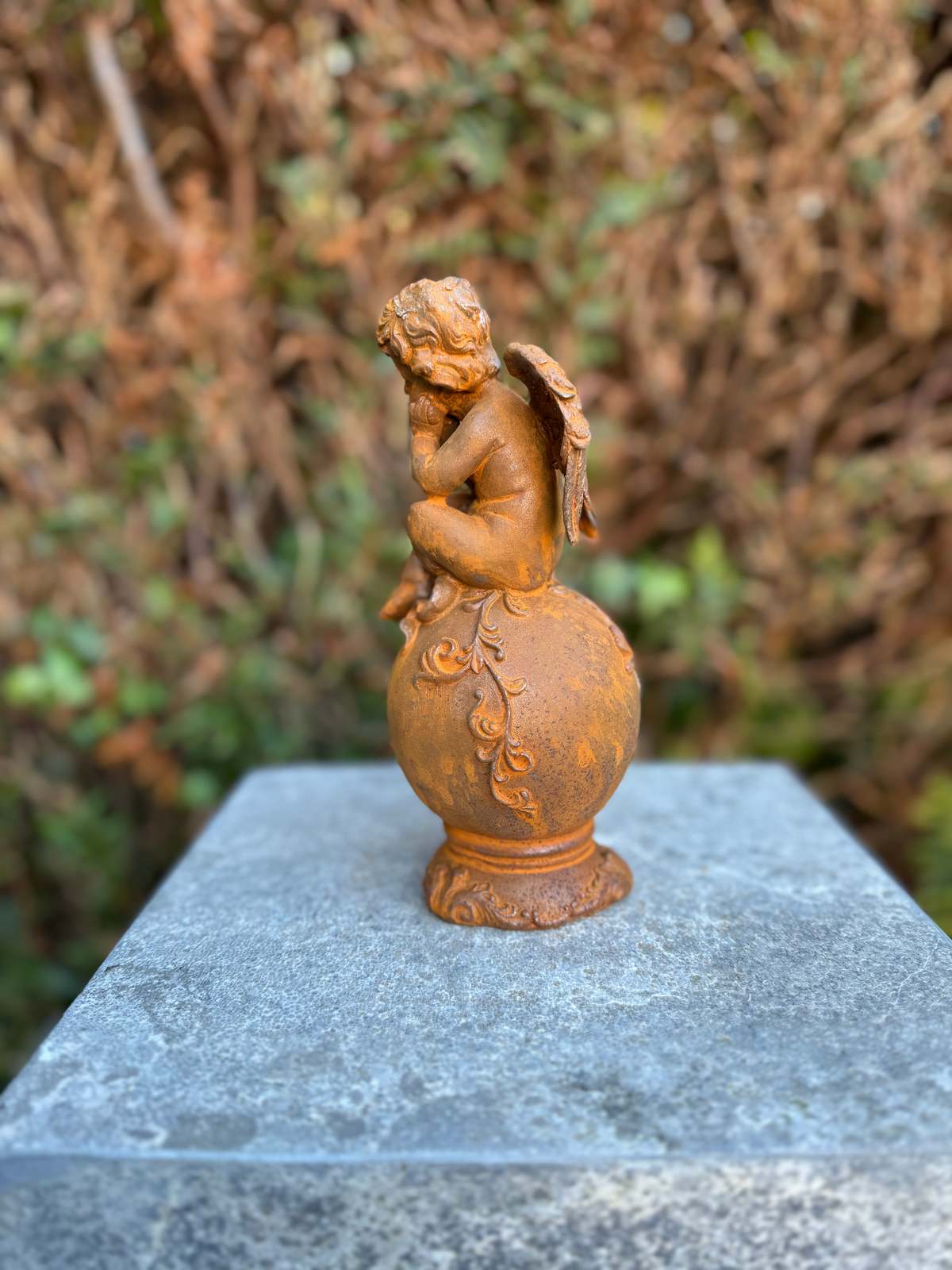 This delicate cast iron sculpture features a cherub sitting peacefully atop an ornate sphere, resting its chin on both hands in a dreamy, introspective pose. With softly sculpted wings and finely worked ornamental details on the base, the piece radiates stillness, innocence, and reflection. Its compact size makes it ideal for intimate spaces, whether in a garden setting, on a windowsill, or as part of a serene decorative corner.