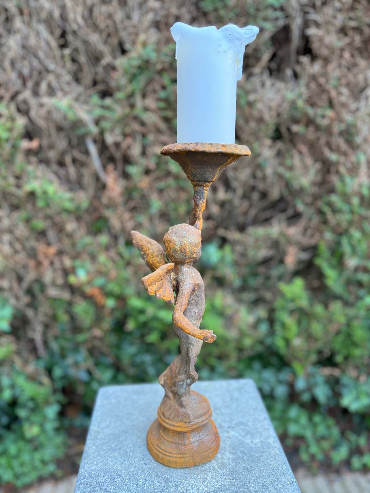 Cast iron angel holding a lantern aloft with grace and strength. A symbolic piece, perfect for your home and as a spiritual, heartfelt gift.