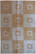 Ce tapis chinois moderne vintage fait main, datant des annees 1980, presente des teintes legeres de blanc et de brun avec un design geometrique moderne. Fabrique en acrylique, il est dans un etat d'origine avec quelques discolorations dues a l'age, ajoutant une touche d'authenticite a l'ensemble.