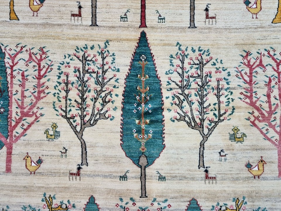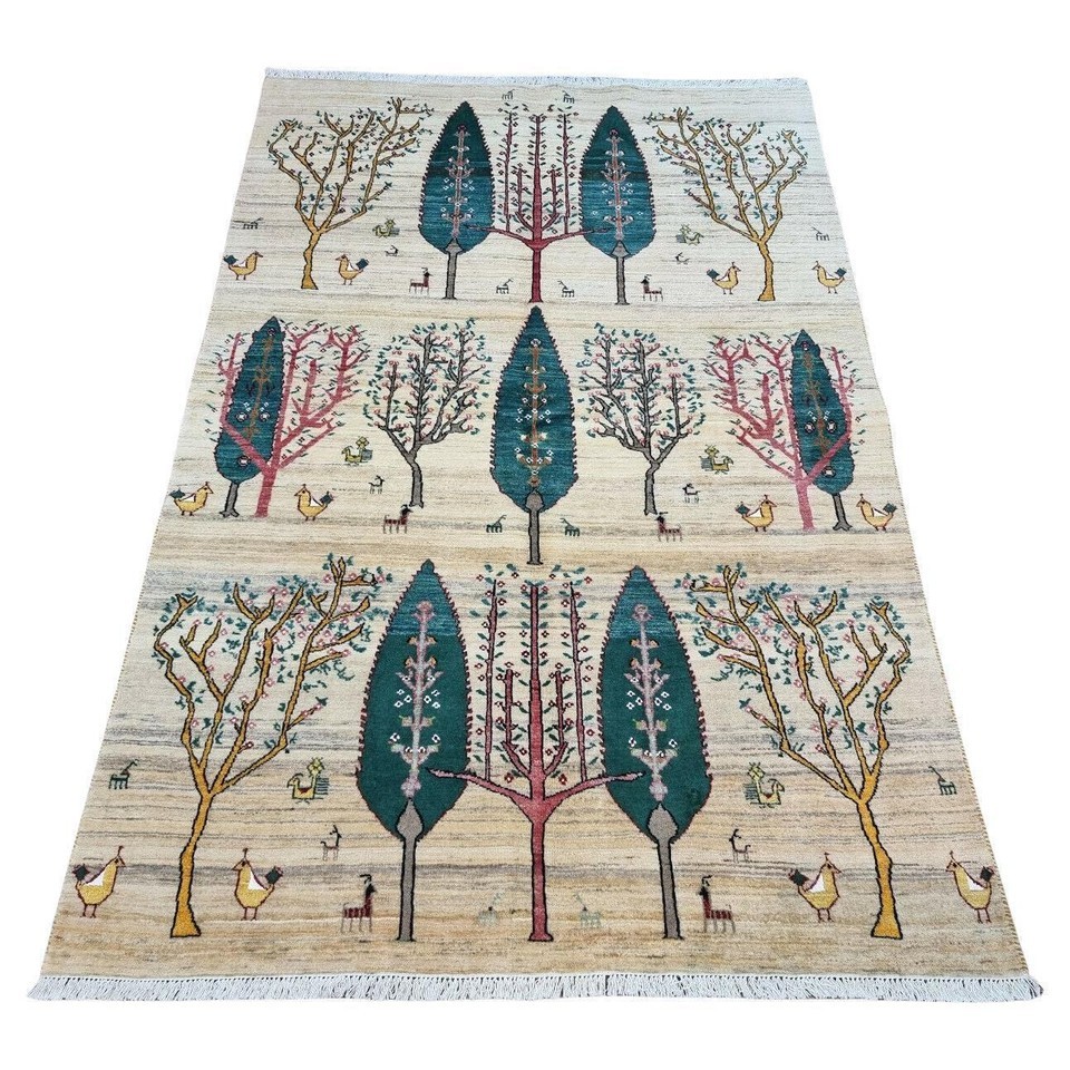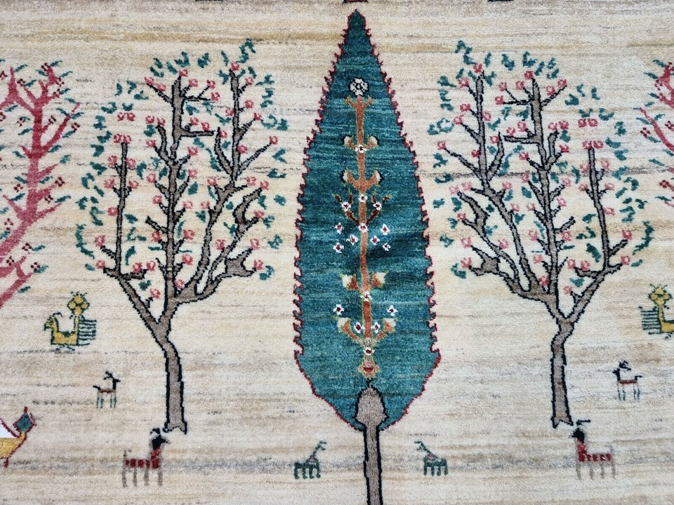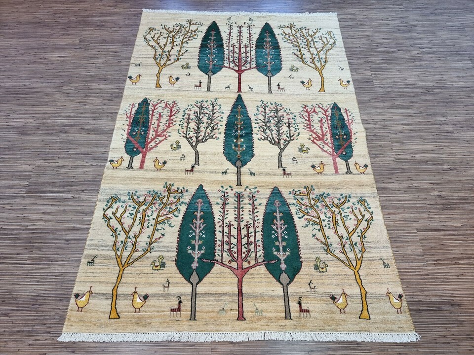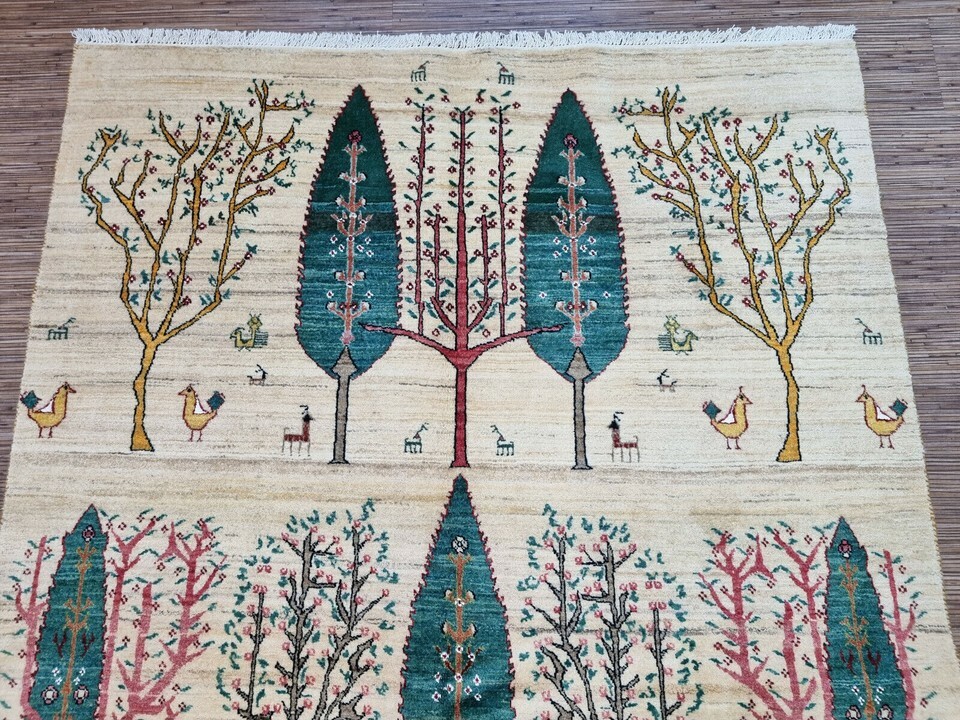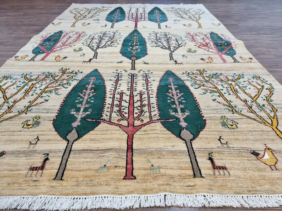 Bring Whimsy and Elegance to Your Home with a Handmade Vintage Persian Gabbeh Rug (1980s) Transform your living space with this delightful Handmade Vintage Persian Gabbeh Rug, skillfully crafted in the 1980s. Measuring 4.8? x 7.1? (146 cm x 216 cm), this rug offers ample coverage while introducing an artistic and playful design to your home. Product Details: Type: Handmade Vintage Persian Gabbeh Rug Origin: Woven in the 1980s Material: Premium-quality wool Condition: Good condition with minimal signs of age-related wear Dimensions: Length: 4.8? (146 cm) Width: 7.1? (216 cm) Weight: Approximately 9 kg (19.8 lbs) Design: A cream-colored background adorned with a whimsical scene of trees and birds Trees feature contrasting hues: dark green leaves with red trunks and yellow leaves with brown trunks Birds, possibly chickens, scattered across the design, perched on branches and walking on the ground Features: Symmetrical arrangement, nature-inspired motif, durable wool construction, handmade artistry This Gabbeh rug combines the playful charm of nature-inspired designs with the elegance of traditional Persian craftsmanship. The cream background serves as a neutral canvas, allowing the vibrant colors of the trees and birds to stand out beautifully. The symmetrical arrangement of elements creates a sense of harmony and balance, while the intricate details of the birds bring a touch of whimsy and liveliness to the piece. The soft wool material ensures both durability and comfort underfoot, making this rug a functional and decorative addition to any space. Whether placed in a living room, bedroom, or study, it becomes a focal point that evokes warmth, joy, and artistic flair. This rug is not just a floor covering but a timeless piece of art that tells a story of nature?s beauty and playful charm, enhancing the character of your home.