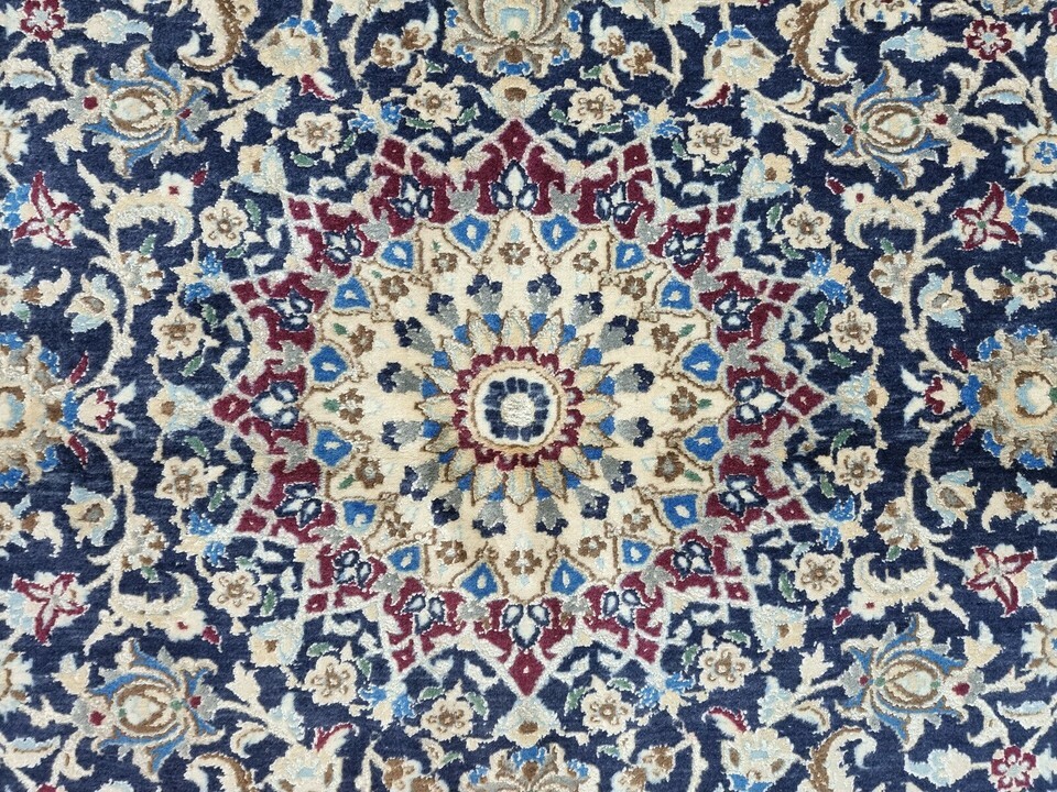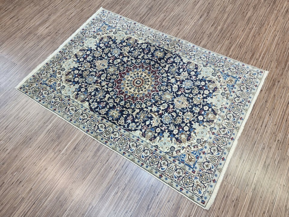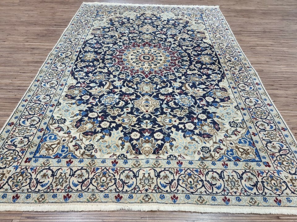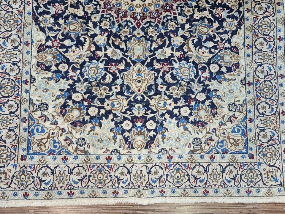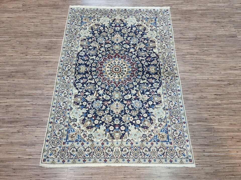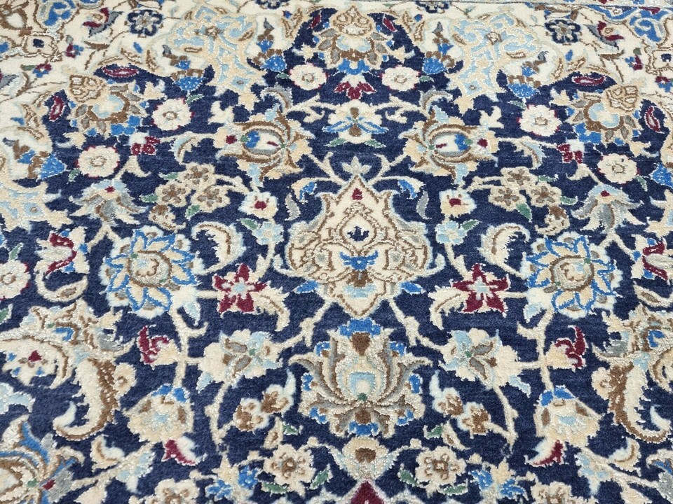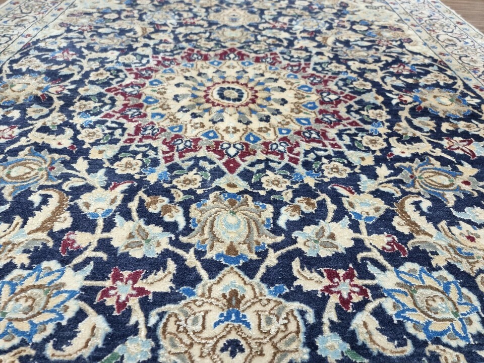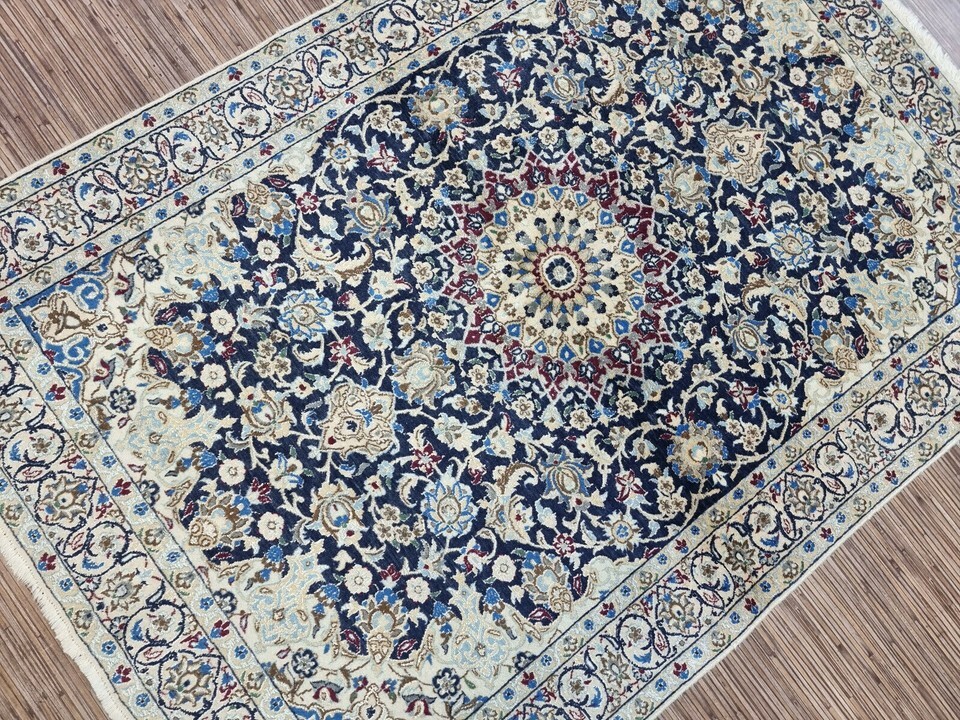 Immerse Your Space in Timeless Elegance with Our Handmade Vintage Persian Style Nain Rug (1980s) Introducing a stunning Handmade Vintage Persian Style Nain Rug, meticulously crafted in the 1980s. This exquisite piece measures 3.2? x 4.6? and is perfect for bringing warmth and history to your living space. Its rich craftsmanship combines premium quality wool and silk highlights, offering an elegant and luxurious feel underfoot. Product Details: Type: Handmade Vintage Persian Style Nain Rug Origin: Woven in the 1980s Material: Wool with Silk Highlights Condition: Good condition, well-preserved Dimensions: Length: 3.2? (96.5 cm) Width: 4.6? (140 cm) Weight: 5.5 kg (12.1 lbs) Design: Central medallion surrounded by intricate floral motifs and ornate designs Color Palette: Harmonious blend of rich blue and cream with silk accents Motifs: Persian floral motifs and ornate designs Features: Silk highlights within the wool weave add a subtle shine and texture The central medallion of the rug commands attention, drawing the eye with its perfect symmetry, while the surrounding floral motifs and ornate designs evoke the spirit of classic Persian artistry. The rich blue and creamy white hues blend seamlessly, creating a sophisticated look that complements any room, from contemporary spaces to traditional interiors. This vintage Nain rug is not only an exceptional floor covering, but it?s a piece of history that showcases the enduring beauty of Persian rug-making traditions. The silk highlights enhance the depth of the design, creating a soft shine that changes with the light. Perfect for a living room, bedroom, or study, this rug adds a touch of elegance and warmth to any decor. Despite its age, the rug has been carefully preserved and remains in good condition, maintaining its integrity and charm. The meticulous craftsmanship of the 1980s ensures that this piece will endure for many more years, adding an element of timeless luxury to your home. Don't miss the opportunity to own this rare and authentic Persian-style masterpiece. This vintage rug is the perfect way to honor tradition while enhancing your living space with sophistication and style.