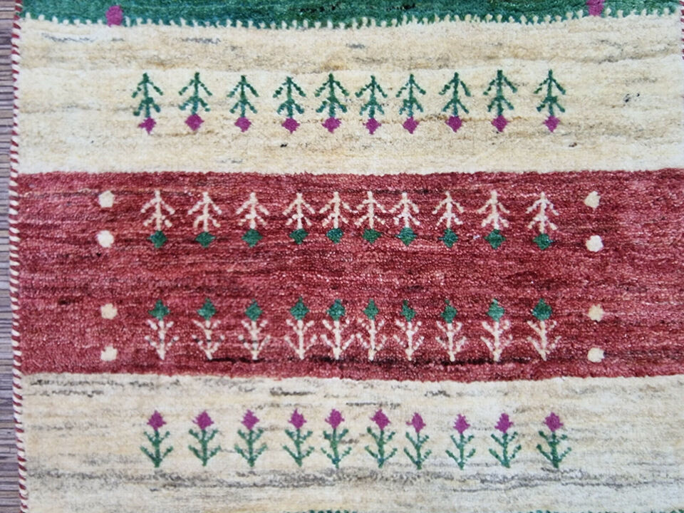 Vintage Persian Gabbeh Hand-Knotted Wool Rug, 87x57 cm / 2.85x1.87 ft (circa 1980s) Elevate your living space with this authentic vintage Persian Gabbeh rug, meticulously hand-knotted by skilled artisans. Created circa the 1980s, this timeless piece represents the rich heritage of Persian craftsmanship. Its compact size makes it an excellent choice for smaller spaces or as an accent rug in larger rooms. This Gabbeh rug features a classic rectangular shape, made from high-quality wool on a cotton foundation. The charming tree motif design adds a touch of nature-inspired elegance, and its neutral beige tones blend beautifully with various interior styles. This piece is brand new, with original tags, and in pristine condition. Key Features: Origin: Persia (modern-day Iran) Age: Circa 1980s Material: 100% hand-spun wool with a cotton foundation Technique: Hand-knotted Design: Tree motif with intricate details Color Palette: Beige with subtle decorative accents (see images for details) Dimensions: Length: 87 cm (2.85 ft) Width: 57 cm (1.87 ft) Condition: Brand new, with original tags. No signs of wear or damage. Uses: Ideal for the living room, bedroom, study, or dining area. Perfect for both traditional and modern interiors. Why Choose a Persian Gabbeh Rug?Gabbeh rugs are cherished for their simplistic beauty, durability, and artistic charm. This particular rug's nature-inspired tree design and compact dimensions make it ideal for smaller rooms, entryways, or as an accent piece under furniture. Its quality craftsmanship ensures it remains a valuable, functional, and decorative item for years to come. Add a touch of Persian elegance to your home with this exquisite Gabbeh rug. A timeless treasure that brings artistry and warmth to any space.