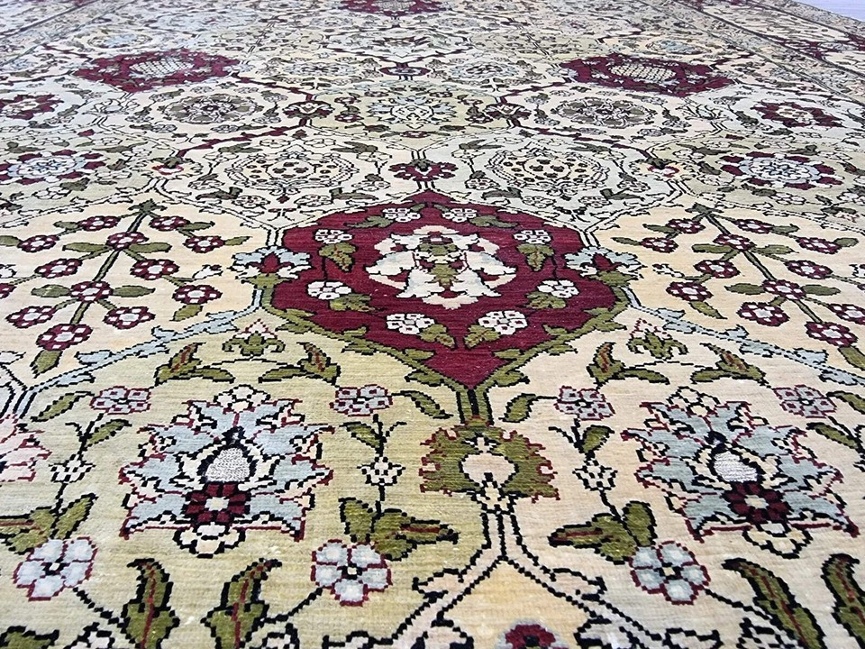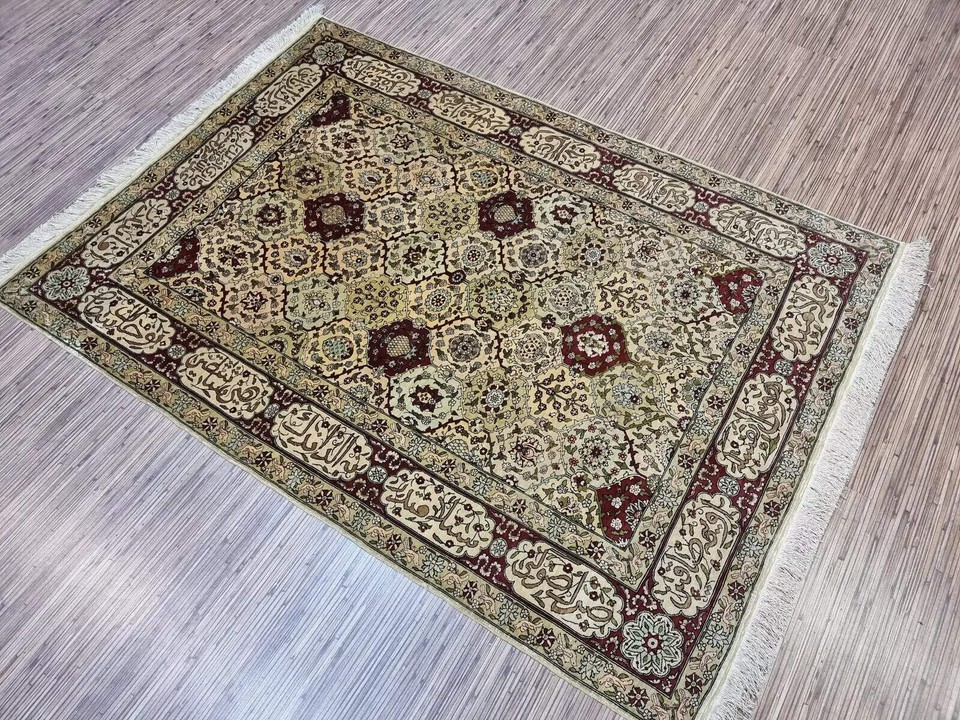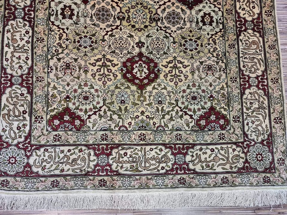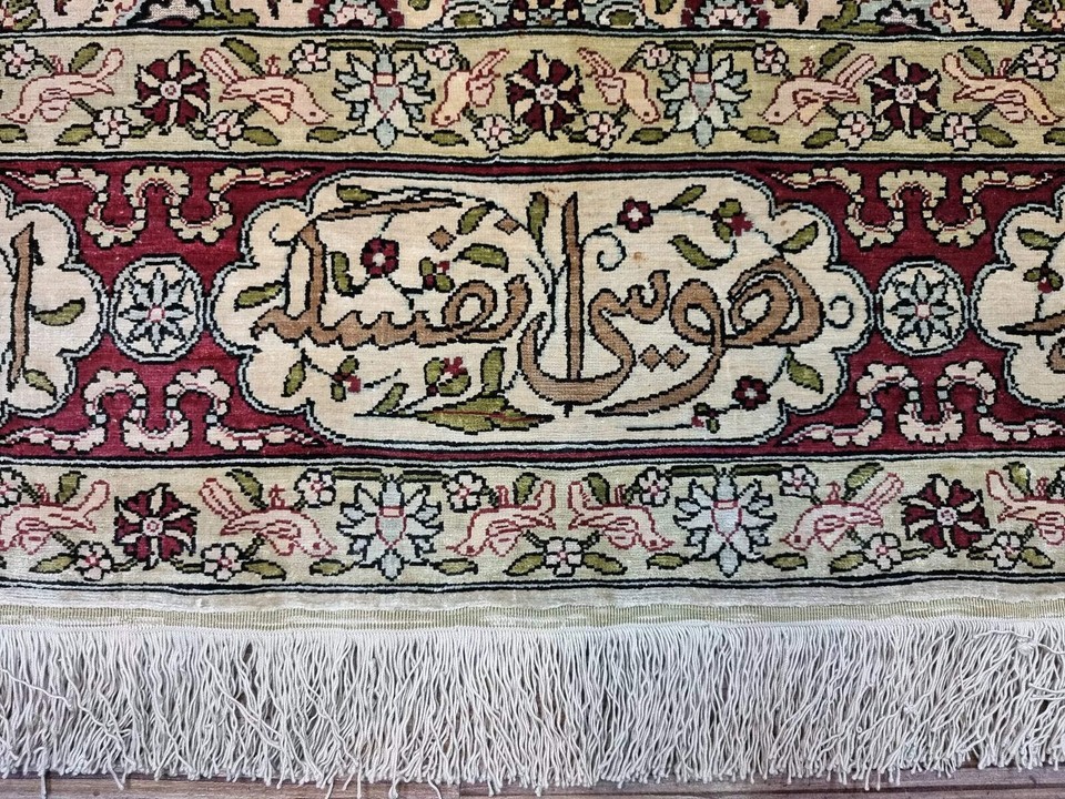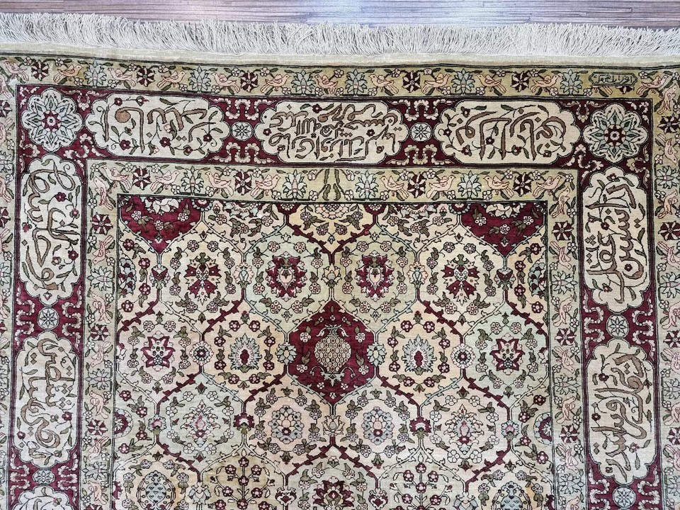 A True Testament to Turkish Artistry ? Vintage Hereke Silk Rug Step into the world of luxury and sophistication with this authentic vintage Turkish Hereke silk rug, meticulously hand-knotted in the 1960s. Renowned for their exquisite craftsmanship, Hereke rugs are considered some of the finest in the world, prized for their intricate designs, unparalleled quality, and rich cultural heritage. This masterpiece features an elegant floral pattern framed by calligraphy-inspired borders, woven with golden beige, burgundy, and turquoise tones. Made of 100% pure silk, the rug boasts a luminous finish that captures light beautifully, enhancing the intricate details. Each knot in this rug represents hours of skilled craftsmanship, making it a true collectible and work of art. Originally displayed as a wall tapestry, this rug has been preserved in excellent condition, ensuring it retains its vibrant colors and luxurious texture. Whether placed on the floor or displayed as a wall hanging, this rug will transform any space with its timeless beauty. Features Details of Vintage Turkish Hereke Silk Rug Origin: Turkey (Hereke Province) Design: Authentic Hereke with floral and calligraphic motifs Material: 100% Pure Silk Weaving Technique: Hand-knotted with exceptional precision Period: 1960-1969 Shape: Rectangular Pattern: Traditional Oriental motif with elegant golden tones Special Use: Previously used as a wall tapestry Dimensions: Length: 143 cm (4.7 ft) Width: 102 cm (3.3 ft) Condition: Excellent vintage condition Professionally cleaned and preserved No visible stains, tears, or significant wear Style: Classic and timeless Versatility: Suitable for living rooms, dining areas, or as a wall hanging Why This Rug Stands Out Masterful Artistry: Each knot is a testament to the dedication of skilled artisans, creating a one-of-a-kind masterpiece. Rich Heritage: An authentic piece from the golden era of Turkish rug-making. Versatile Design: Complements both traditional and modern interiors, making it a perfect statement piece. Pristine Condition: Carefully maintained and professionally cleaned to ensure its longevity. This Turkish Hereke silk rug combines luxury, history, and artistry, making it a perfect investment for collectors or anyone looking to add a touch of elegance to their home.