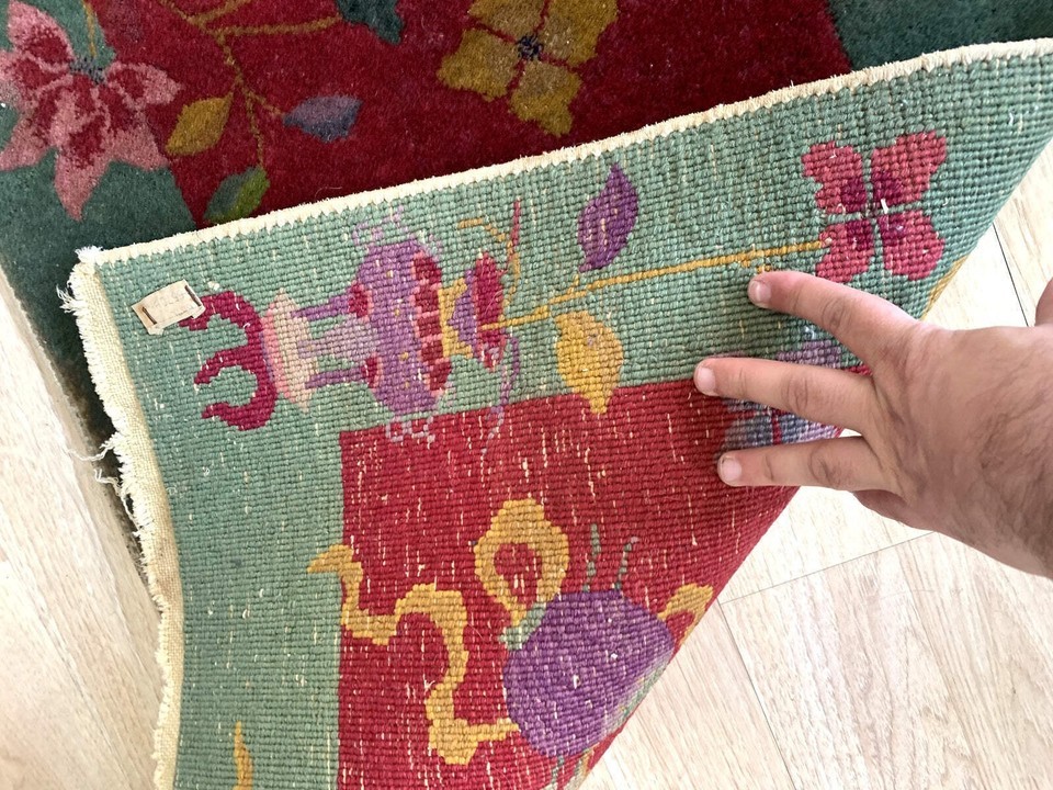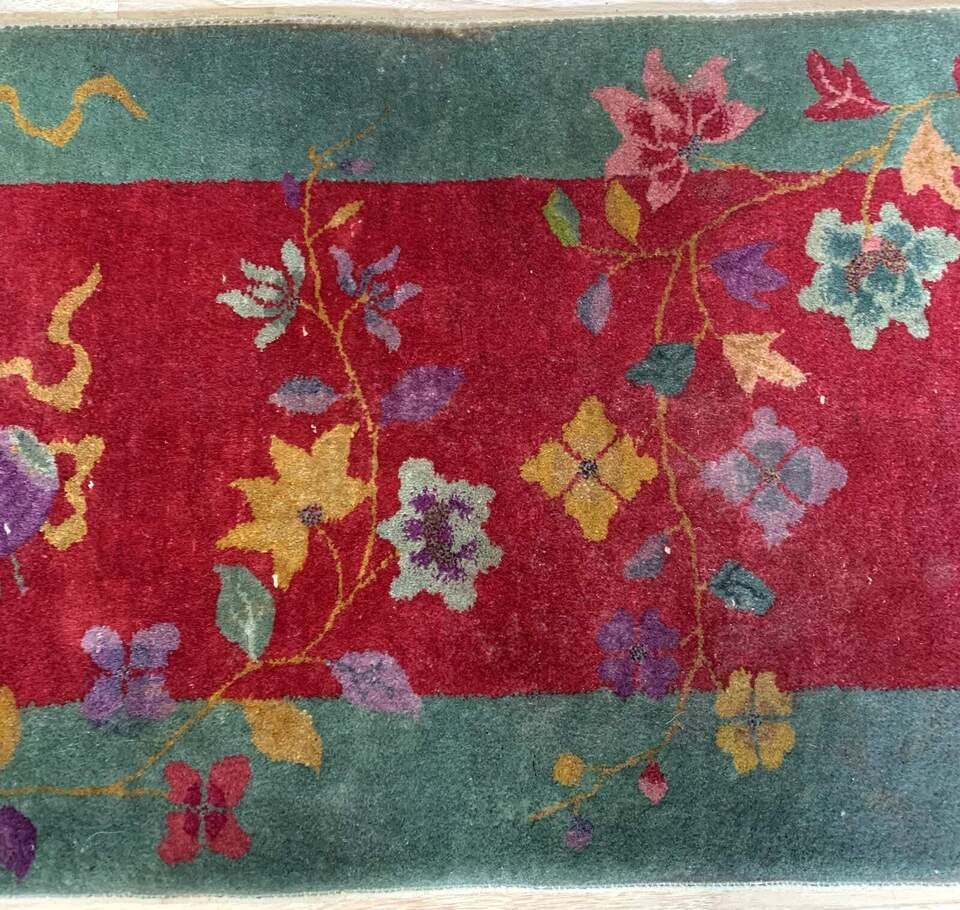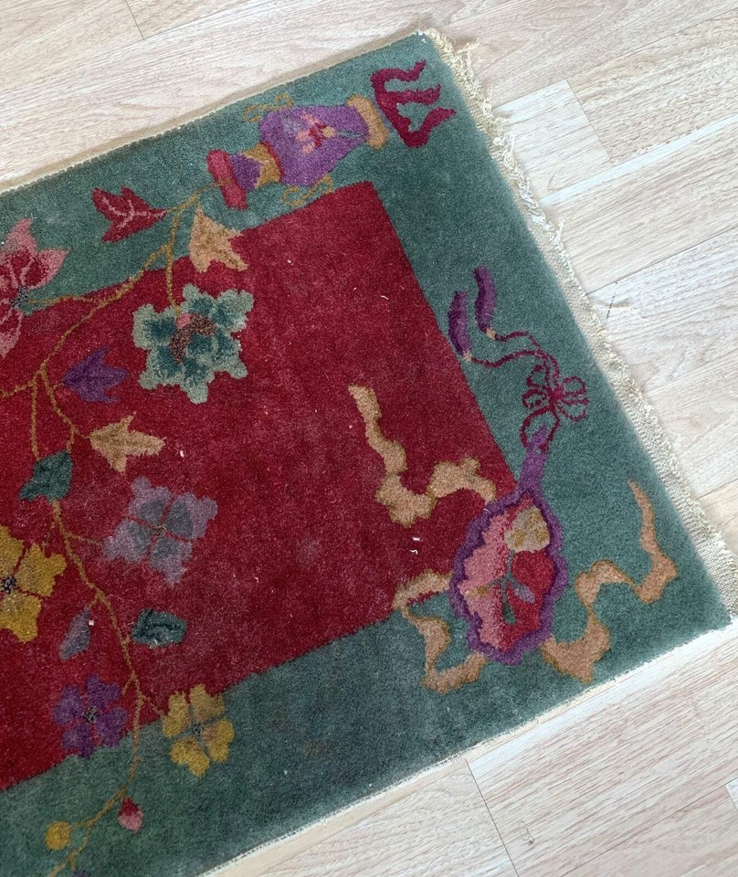 This exquisite Art Deco Chinese rug from the 1920s is a true work of art. Handmade with meticulous attention to detail, it features a captivating design in rich, vibrant colors. The background colors of deep red, grass green, purple, beige, and yellow create a harmonious and luxurious palette that will instantly elevate any space. The rug is made of high-quality wool, which adds to its durability and longevity. The intricate pattern showcases the skilled craftsmanship of the artisans who created it, with geometric motifs and floral elements that exude a sense of elegance and sophistication. The size of 2.2' x 4.1' (67cm x 124cm) makes it a versatile piece that can be used in various settings, from a cozy living room to a formal dining area. Despite its age, this rug is in original good condition, a testament to its quality and craftsmanship. It carries the charm of a bygone era and will be a cherished addition to any antique or Art Deco collection. With its unique design and timeless appeal, this Art Deco Chinese rug is sure to be a conversation starter and a focal point in any room. Don't miss the opportunity to own this exquisite piece of history - a true masterpiece that combines art, craftsmanship, and history in one breathtaking rug. -condition: original good, -circa: 1920s, -size: 2.2' x 4.1' (67cm x 124cm), -material: wool, -country of origin: China, -style: Art Deco, -background colors: deep red, grass green, purple, beige, yellow.