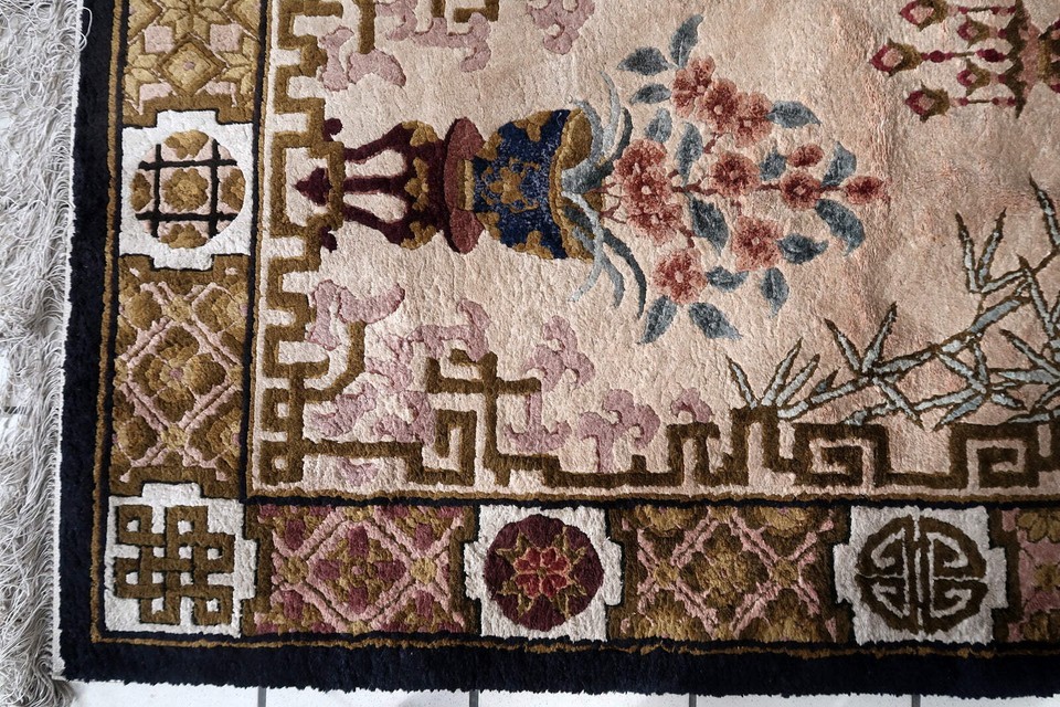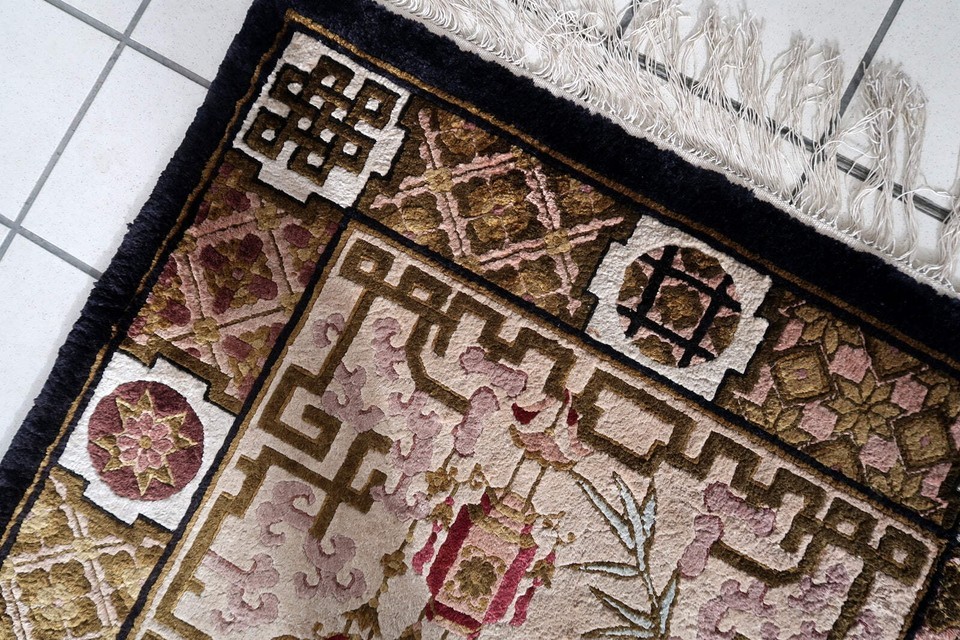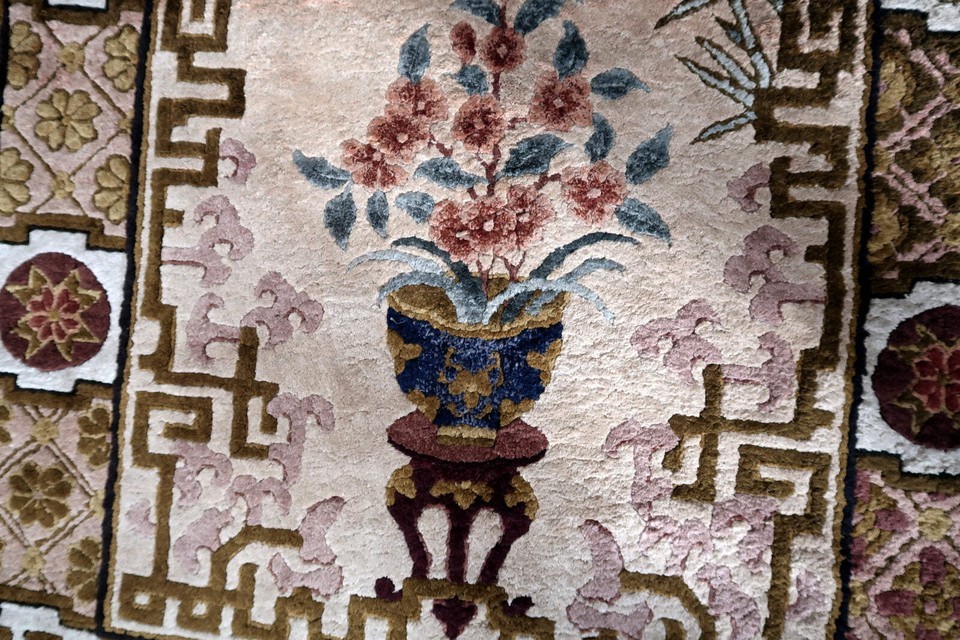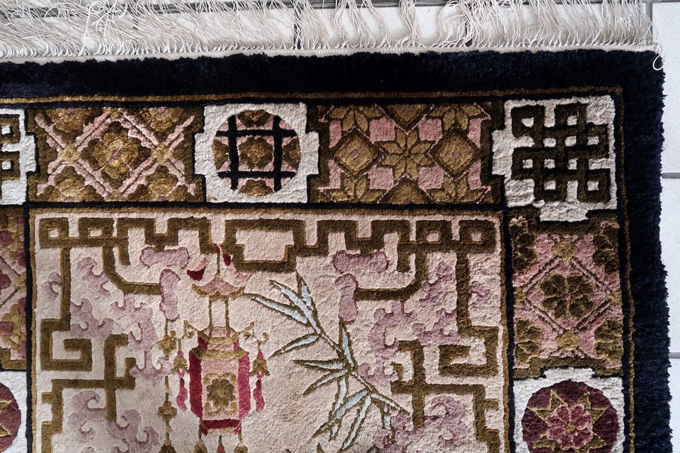 Introducing our exquisite Vintage Art Deco Chinese Silk Rug from the 1960s, measuring 2.9? x 5? and exuding timeless elegance. Dimensions of this Vintage Art Deco Chinese Silk Rug: Size: 2.9? x 5? (90cm x 154cm) Shape: Rectangular Material and Condition: Crafted from luxurious silk, this rug radiates elegance and sophistication. Remarkably well-preserved in good condition, showcasing meticulous care over the years. Design and Colors: Intricate and detailed design reflecting traditional Chinese artistry. Base Color: Cream, providing a neutral and versatile backdrop. Accent Colors: Harmonious palette featuring shades of brown, red, green, and blue. Central Floral Arrangements: Two prominent floral motifs adorn the center, one larger and more colorful. Bamboo-like Plants: Delicately depicted on one side, adding natural charm. Border Patterns: Intricate geometric designs and symbols frame the rug elegantly. Visible Fringe: The fringe at the top end signifies the rug's excellent condition. Elevate Your Space: A true masterpiece, blending tradition with timeless beauty, this vintage silk rug is a remarkable addition to any space.