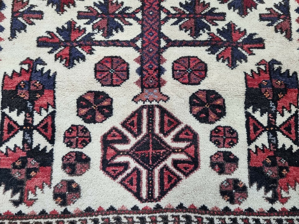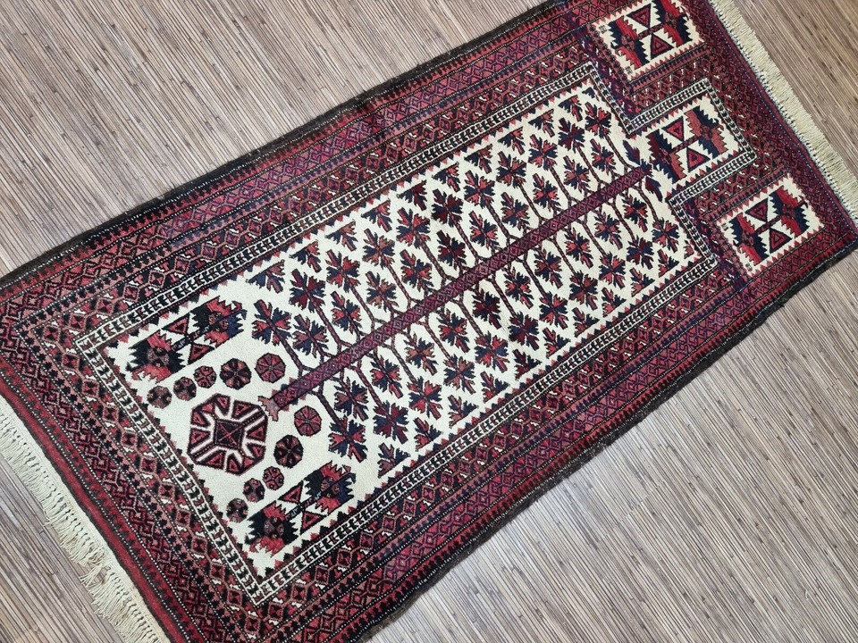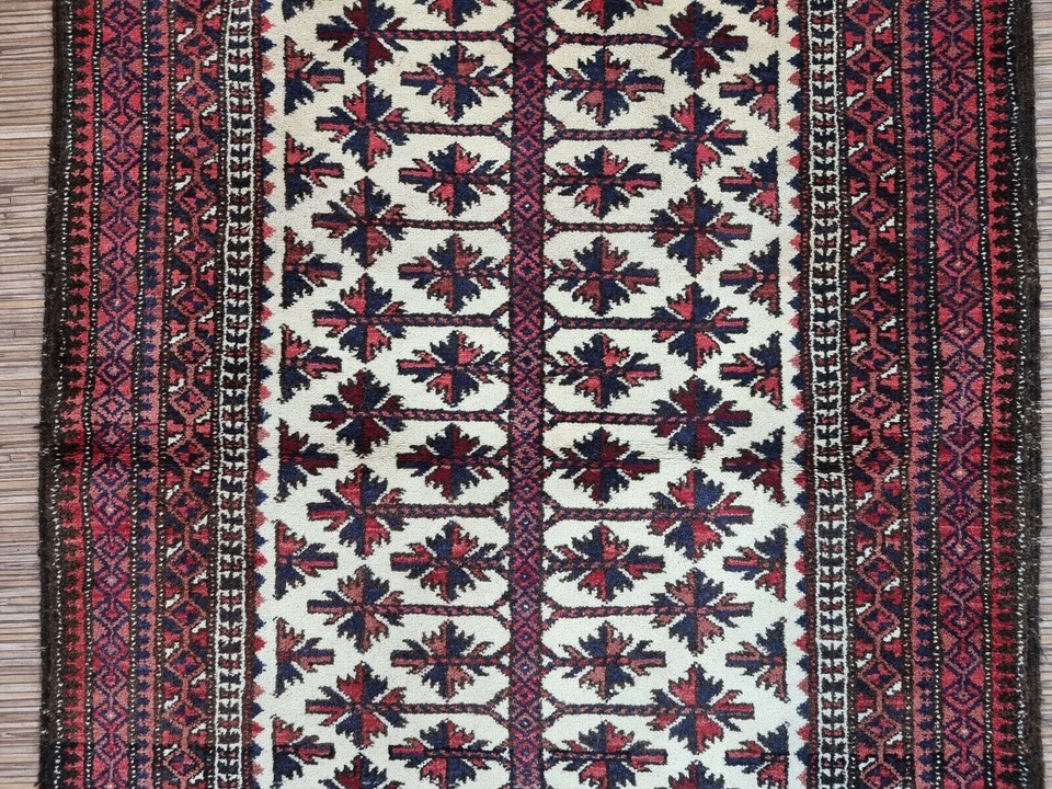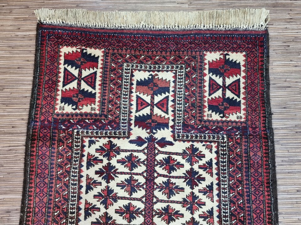 Immerse yourself in the rich cultural heritage of Afghanistan with this captivating Handmade Vintage Afghan Baluch Prayer Rug (2.7' x 5.5'). Handwoven in the 1950s, this rug exemplifies the intricate artistry and symbolism of the Baluch people. The rug features a complex geometric design, characteristic of Baluch rugs, where deep red and navy blue hues are woven into a dominant cream-colored field. Repeated patterns and a central motif showcase the meticulous craftsmanship involved in its creation. Bordering the central field is an elaborate framework of detailed patterns and motifs, each potentially telling a story rooted in Afghan culture. The rug's well-preserved edges and fringes add to its traditional aesthetic appeal. Woven from high-quality wool, this Handmade Vintage Afghan Baluch Prayer Rug offers not only beauty but also durability and comfort underfoot. Despite its age, the rug is in good condition with only minor signs of wear and tear, a testament to the careful preservation that has allowed it to retain its vibrant colors and intricate designs. This rare and valuable artifact is more than just a rug; it's a conversation starter and a window into Afghan culture. Here's a closer look at the features that make this rug so special: Rich Cultural Heritage: Experience the beauty and tradition of Baluch craftsmanship in this rug's intricate design and symbolism. Striking Visual Contrast: Deep red and navy blue hues beautifully complement the dominant cream-colored field. Meticulous Craftsmanship: Immerse yourself in the detailed central motif, repeated patterns, and elaborate border designs. Timeless Design: This rug's classic geometric patterns will complement any decor style. Durable Comfort: The high-quality wool construction ensures long-lasting beauty and comfortable everyday use.