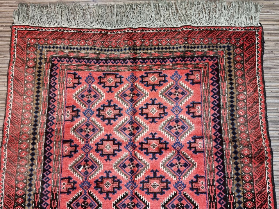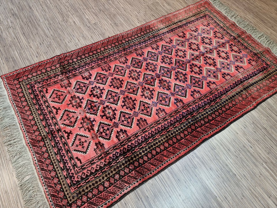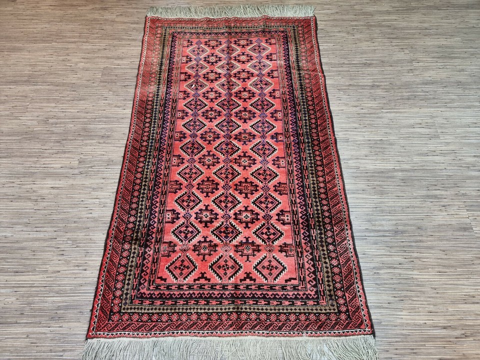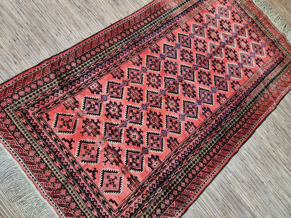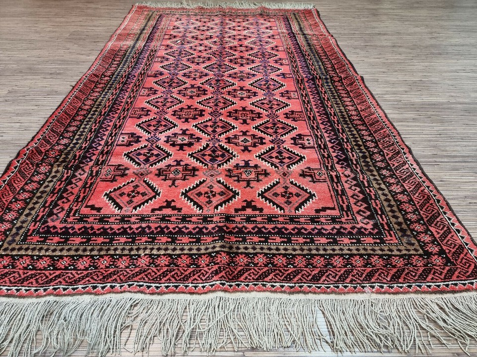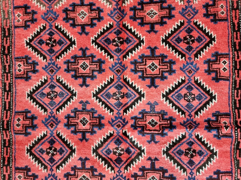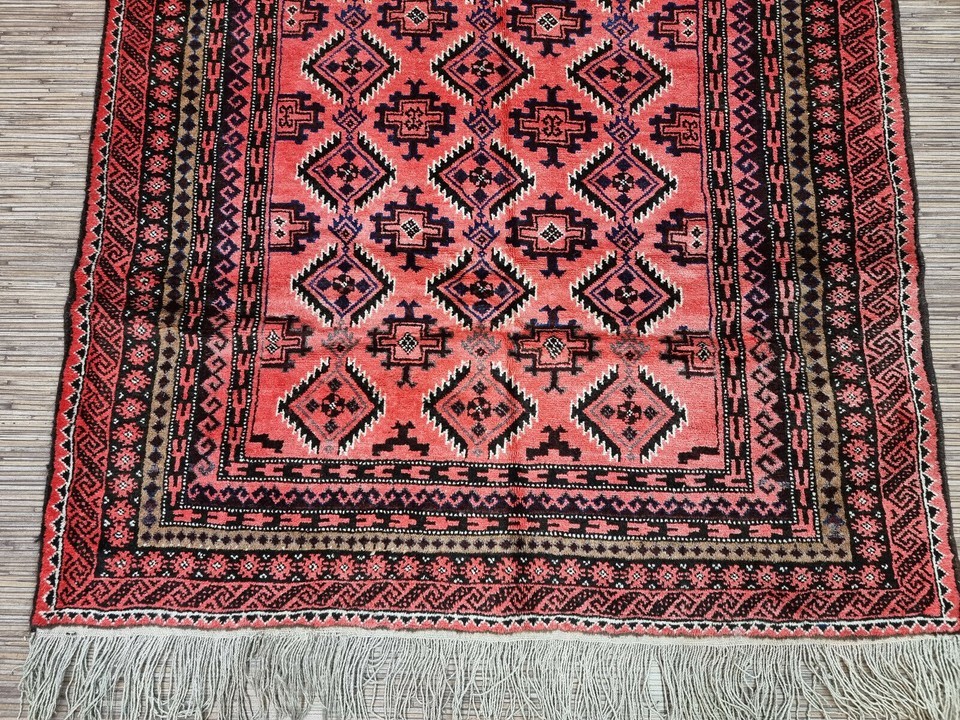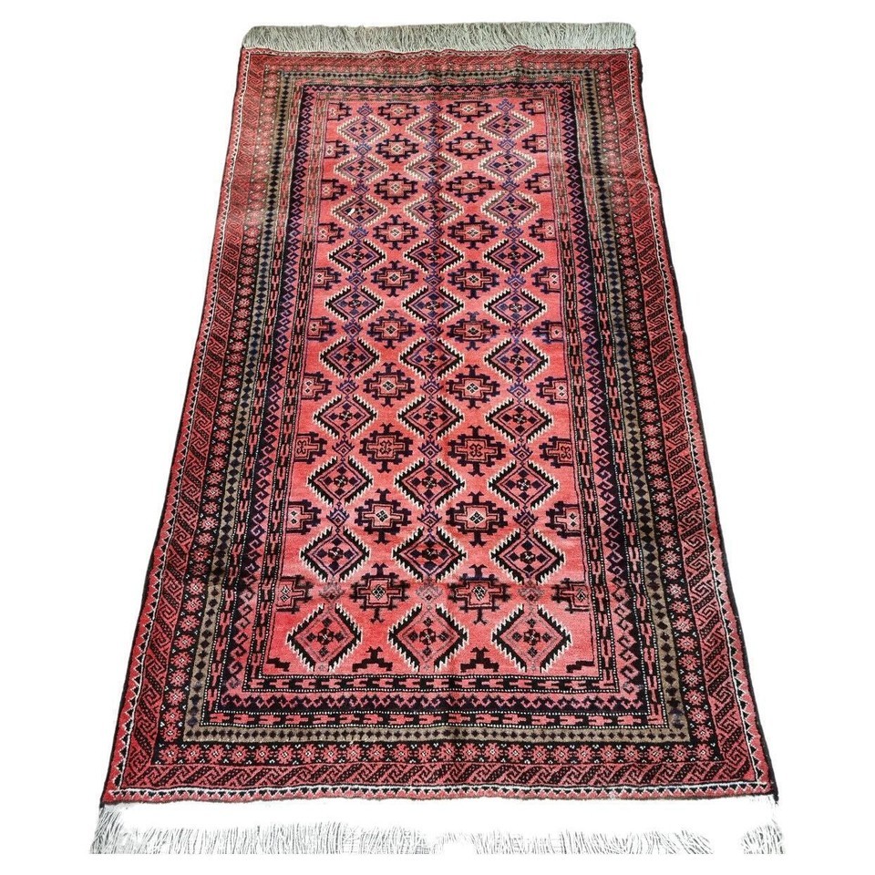 Awaken Your Inner Nomad: Handwoven Afghan Baluch Prayer Rug (1960s) Embark on a journey through time and culture with this captivating Vintage Afghan Baluch Prayer Rug. Dating back to the 1960s, this vintage piece transcends its religious origin, offering a touch of bohemian charm and rich heritage to your home. Woven with Purpose: Timeless Craft: Crafted from premium wool by skilled Afghan artisans, this rug embodies centuries-old traditions with a focus on quality and intricate detailing. A Visual Narrative: The rich red base symbolizes life and vitality, while the captivating geometric patterns in black, white, and various shades of red tell a captivating story on your floor. The Mihrab Symbolism: The repeated diamond shapes in the central field represent the mihrab, a significant niche within mosques that indicates the direction of Mecca. A Versatile Treasure: Ideal for Compact Spaces: Measuring 2.4' x 4.7' (76cm x 145cm), this rug is perfectly suited for smaller areas or entryways, adding a touch of warmth and cultural flair. Wall-Worthy Beauty: The decorative tassels and intricate design make this rug a captivating wall hanging, transforming any space into a bohemian haven. Built to Last: The high-quality wool ensures long-lasting durability and a luxuriously soft feel underfoot, making it a cherished part of your home for years to come. More Than a Rug, a Conversation Starter: This vintage Afghan Baluch prayer rug is not just a decorative piece; it's a window into a rich cultural heritage and a captivating conversation starter. In good condition, it's ready to grace your home and become a treasured heirloom.