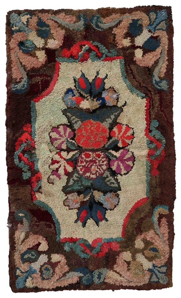 Handmade antique American Hooked rug in floral design. The rug is from the end of 19th century. It is in good condition, has some old restorations.
