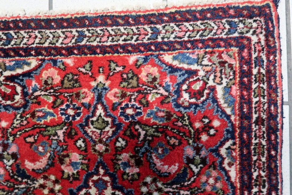 Elevate your living space with the timeless elegance of our Handmade Vintage Persian Sarouk Rug from the 1960s. Measuring 1.9 feet by 2.6 feet (60cm x 81cm), this exquisite rug is a masterpiece of Persian artistry, showcasing intricate details and captivating colors that will transform any room. In original good condition, this Sarouk rug carries the charm of its age and craftsmanship, adding a touch of authenticity to your decor. Crafted with meticulous care from high-quality wool, it offers both durability and a soft, luxurious texture underfoot. The rich blend of red, navy blue, olive green, pink, and beige background colors creates a harmonious palette that infuses warmth and character into your interior. This rug hails from the Middle East, reflecting the iconic Sarouk style known for its ornate floral motifs and cultural significance. Embrace the cultural heritage and beauty of this Handmade Vintage Persian Sarouk Rug. Whether placed in a living room, bedroom, or hallway, its vibrant colors and intricate design will be a captivating focal point, bringing an air of tradition and elegance to your space. -condition: original good, -circa: 1960s, -size: 1.9' x 2.6' (60cm x 81cm), -material: wool, -country of origin: Middle East, -style: Sarouk, -background colors: red, navy blue, olive green pink, beige.