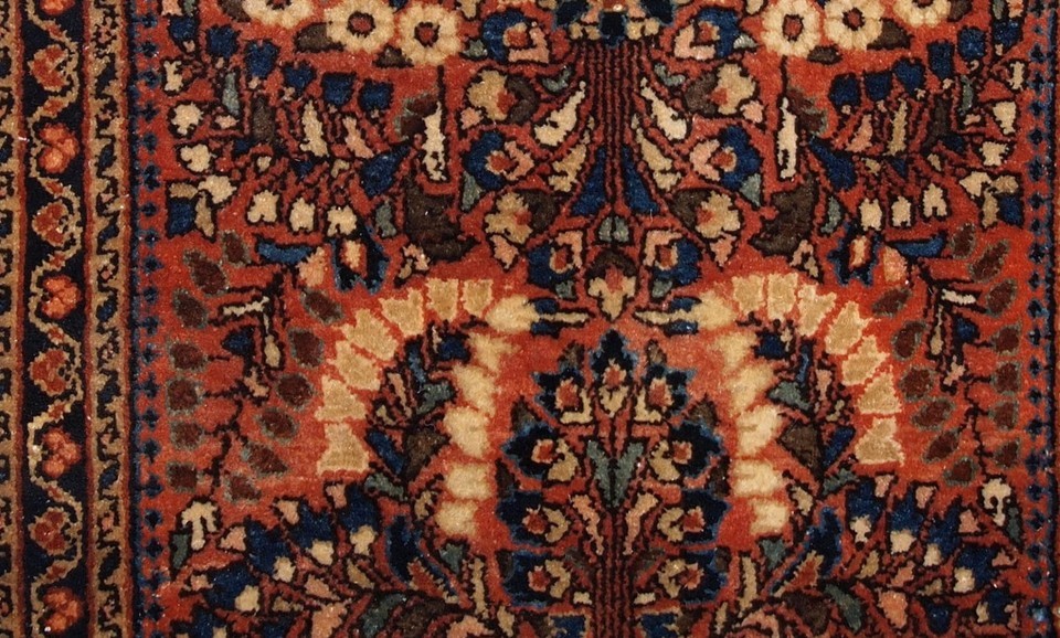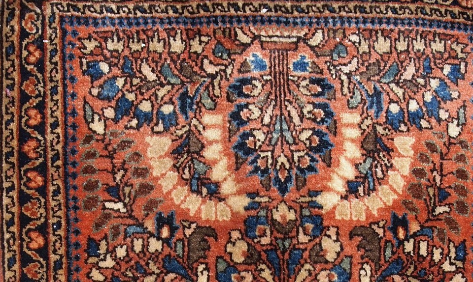 Handmade antique Persian Sarouk rug in original good condition. The rug is from the beginning of 20th century made in traditional design.-condition: original good,-circa: 1920s,-size: 2.1' x 3.2' (64cm x 97cm),-material: wool,-country of origin: Middle East,-style: Sarouk,-background colors: red, blue, beige.