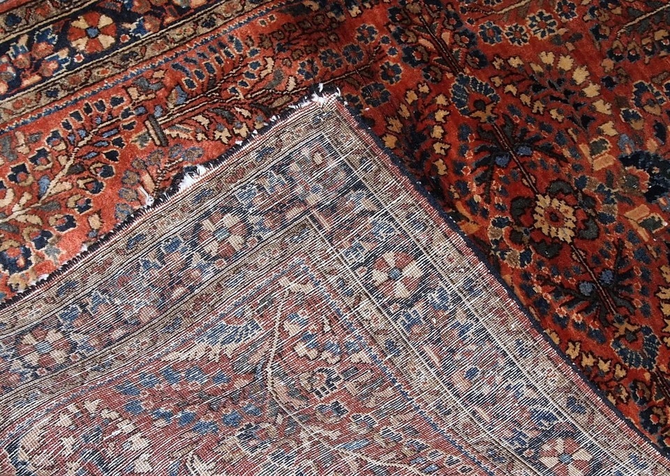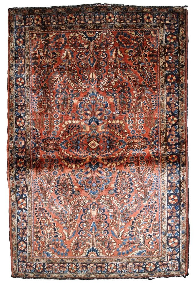 Handmade antique Persian Sarouk rug in original good condition. The rug is from the beginning of 20th century made in red wool.-condition: original good,-circa: 1920s,-size: 3.4' x 5.5' (103cm x 167cm),-material: wool,-country of origin: Middle East,-style: Sarouk,-background colors: navy blue, red, beige.