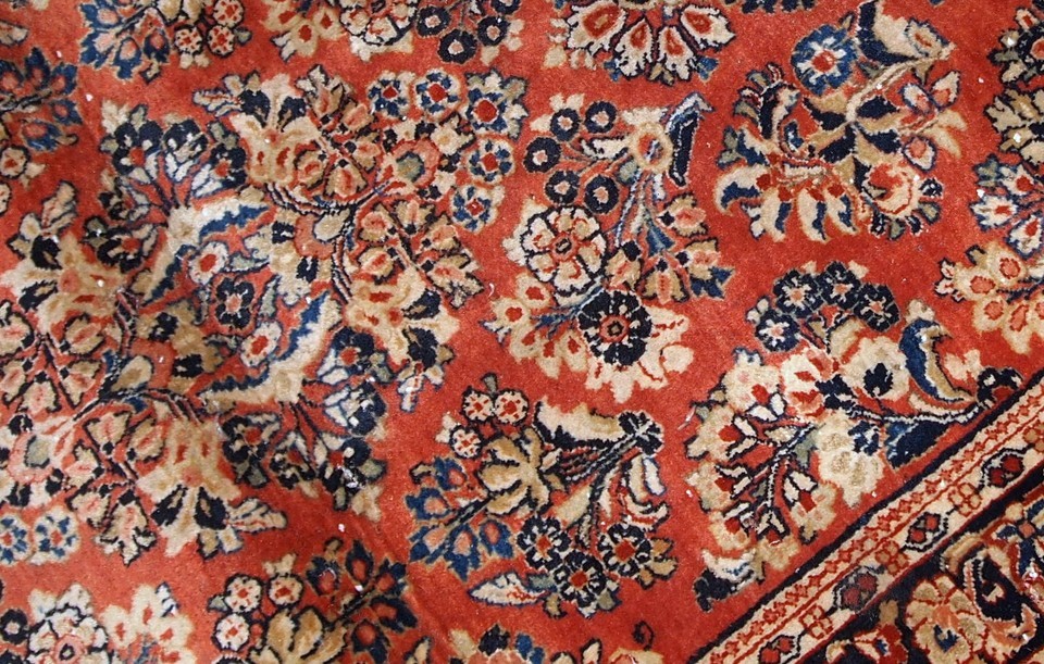 Handmade antique Persian Sarouk rug in original good condition. The rug is from the beginning of 20th century made in traditional floral design.-condition: original good,-circa: 1920s,-size: 3.3' x 5.4' (100cm x 164cm),-material: wool,-country of origin: Middle East,-style: Sarouk,-background colors: red, dark blue, beige.