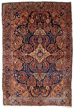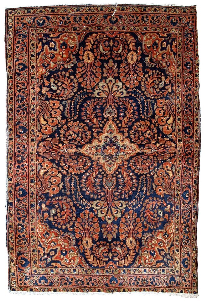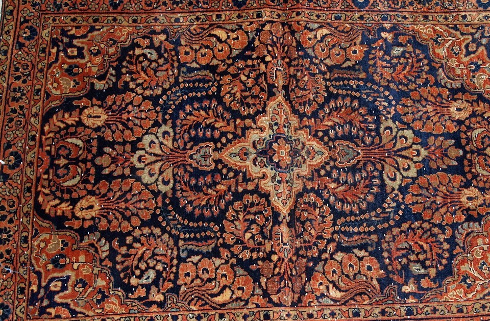 Handmade antique Persian Sarouk rug in original condition, it has some signs of age. The rug is from the beginning of 20th century made in red wool.-condition: original, some signs of age,-circa: 1920s,-size: 3.4' x 5.3' (103cm x 161cm),-material: wool,-country of origin: Middle East,-style: Sarouk,-background colors: navy blue, red, olive.