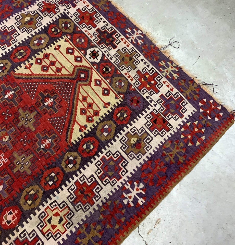 Handmade antique prayer Turkish kilim in bright shades. The rug is from the beginning of 20th century in original good condition.-condition: original good,-circa: 1900s,-size: 4.5' x 6.2' (137cm x 189cm),-material: wool,-country of origin: Turkey,-style: Anatolian,-background colors: white, purple, red, yellow.