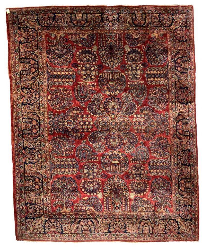 Handmade antique Muiddle Eastern rug in traditional floral design. The rug is from the beginning of 20th century in original good condition.-condition: original good,-circa: 1920s,-size: 9.1' x 11.6' (277cm x 353cm),-material: wool,-country of origin: Middle East,-style: Sarouk,-background colors: navy blue, red, green.