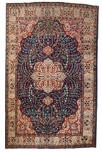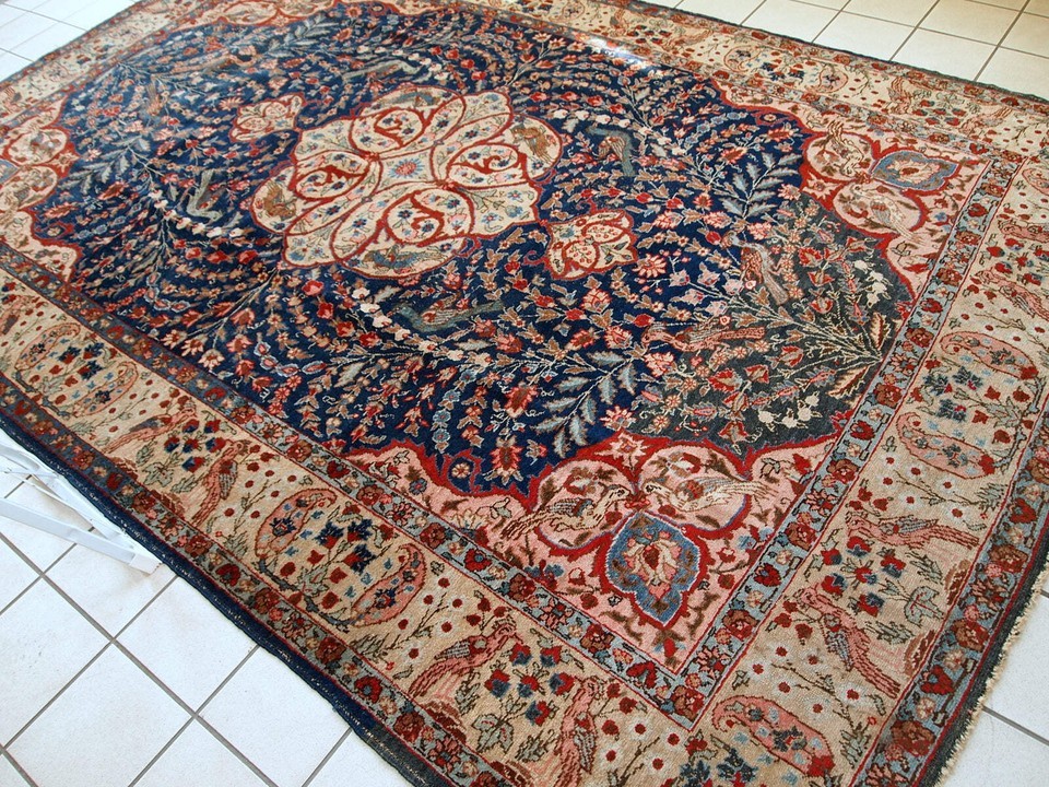 Antique Tabriz rug in original good condition. This beautiful masterpiece made in the beginning of 20th century in navy blue and pink shades.-condition: original good, -circa: 1920s,-size: 6,2' x 9.5' (190cm x 292cm),-material: wool,-country of origin: Persia,-style: Tabriz,-background colors: beige, red, sky blue.