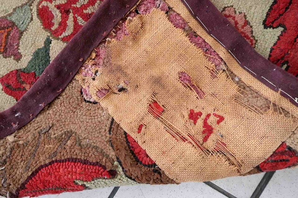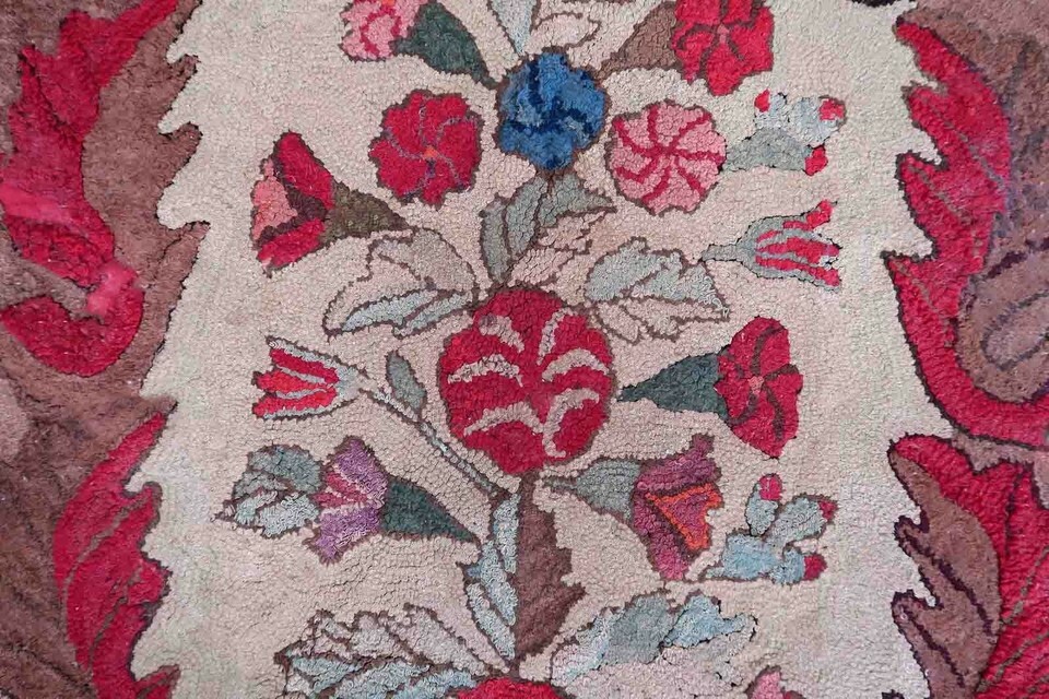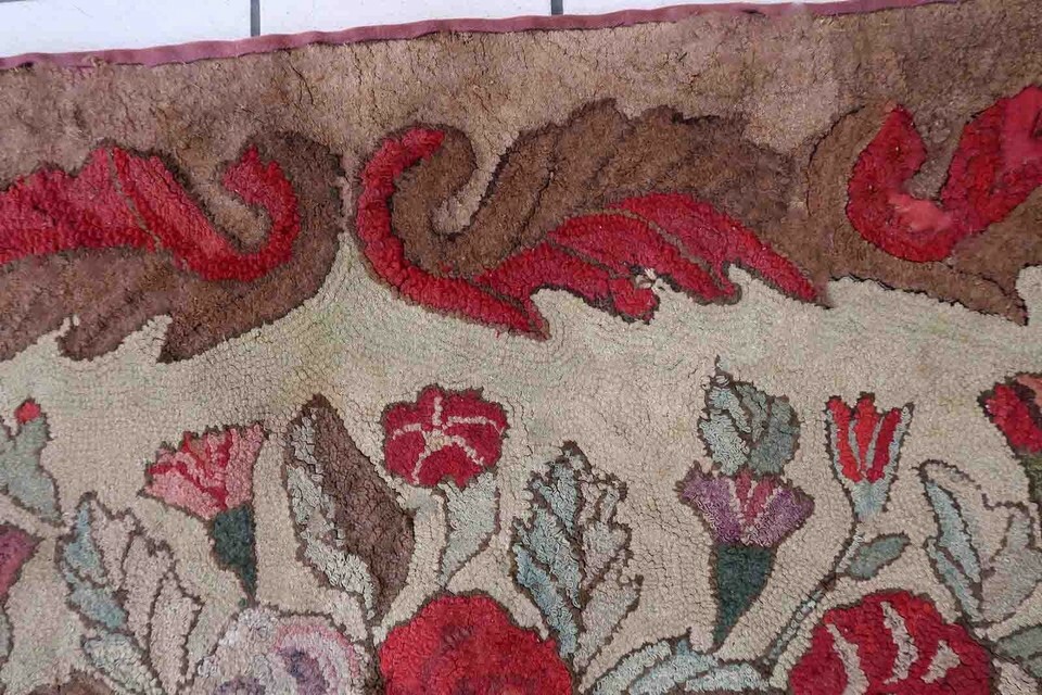 Handmade antique American Hooked rug in floral design. The rug is from the end of 19th century in good condition, the rug has old restorations.