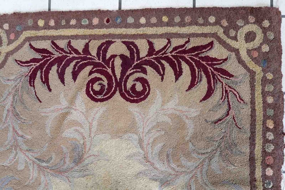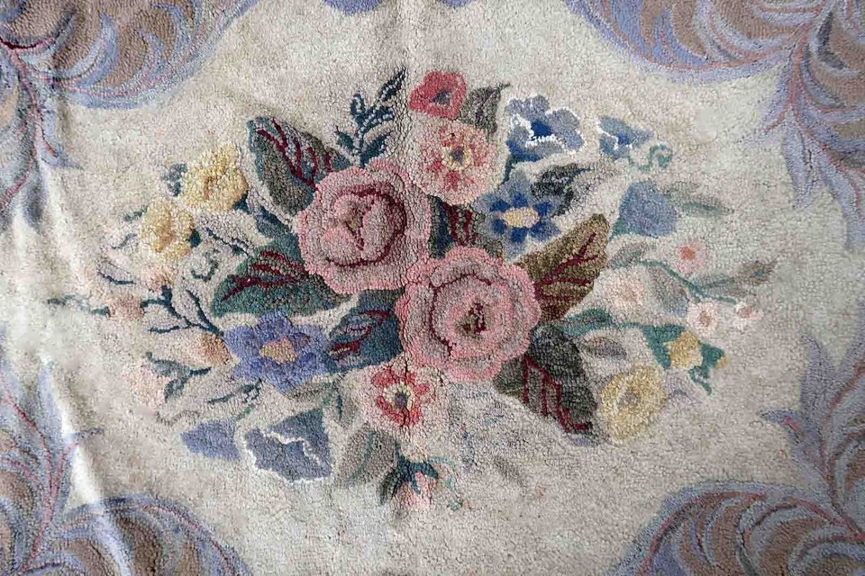 Handmade antique American Hooked rug in floral design. The rug is from the end of 19th century. It is in good condition, has some old restorations.