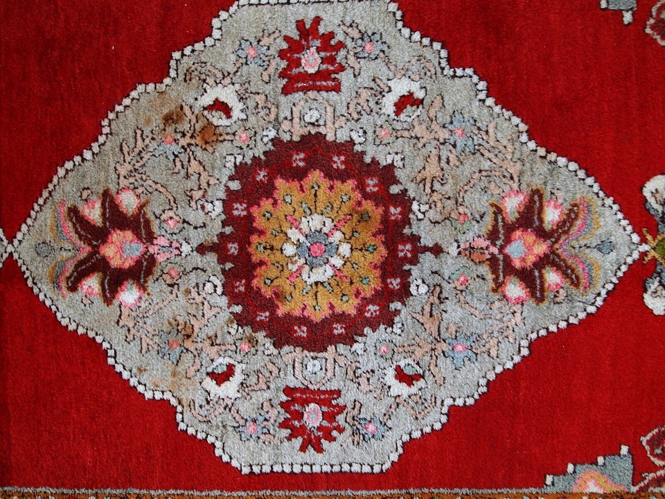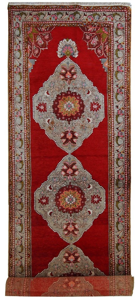 Vintage woollen Turkish Oushak runner in original good condition. It is in bright red shades with sky blue medallions. The wool is very soft.