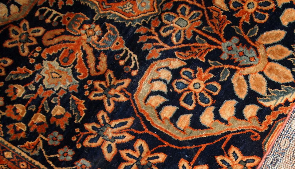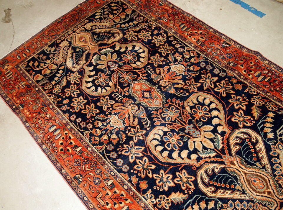 Antique hand-woven Oriental rug in navy blue colour. The rug is in original good condition, made in the beginning of 20th century.